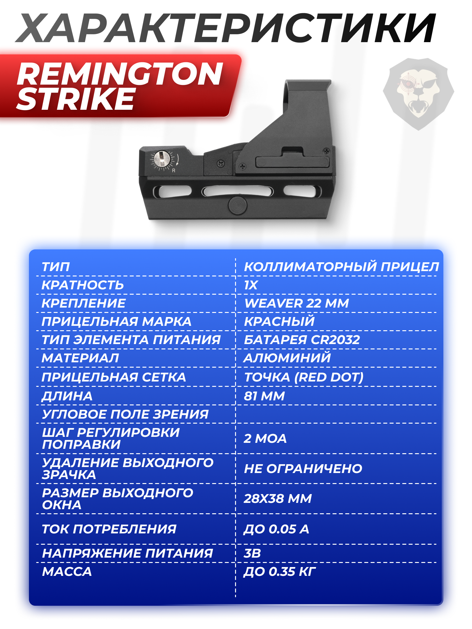 Информация о товаре "Коллиматорный прицел Remington Strike 1x28x38 (Weaver)" носит ознакомительный характер, и не является публичной офертой, определяемой положениями Статьи 437 Гражданского кодекса Российской Федерации, характеристики, внешний вид, цвет и комплектация могут быть изменены производителем без уведомления.