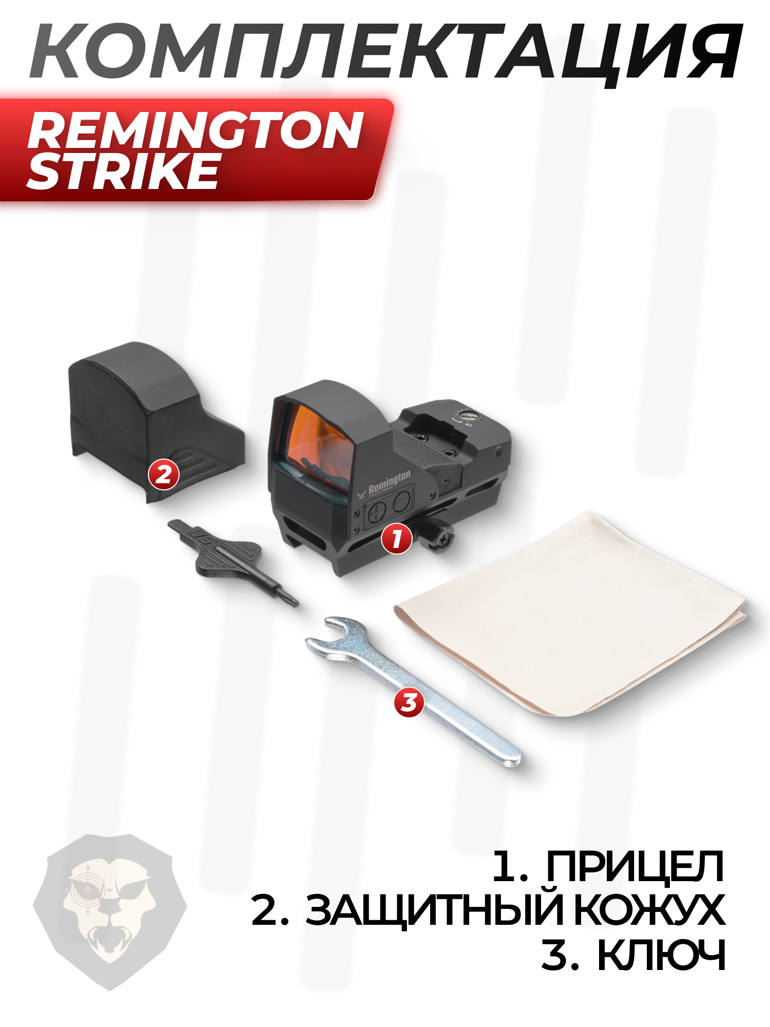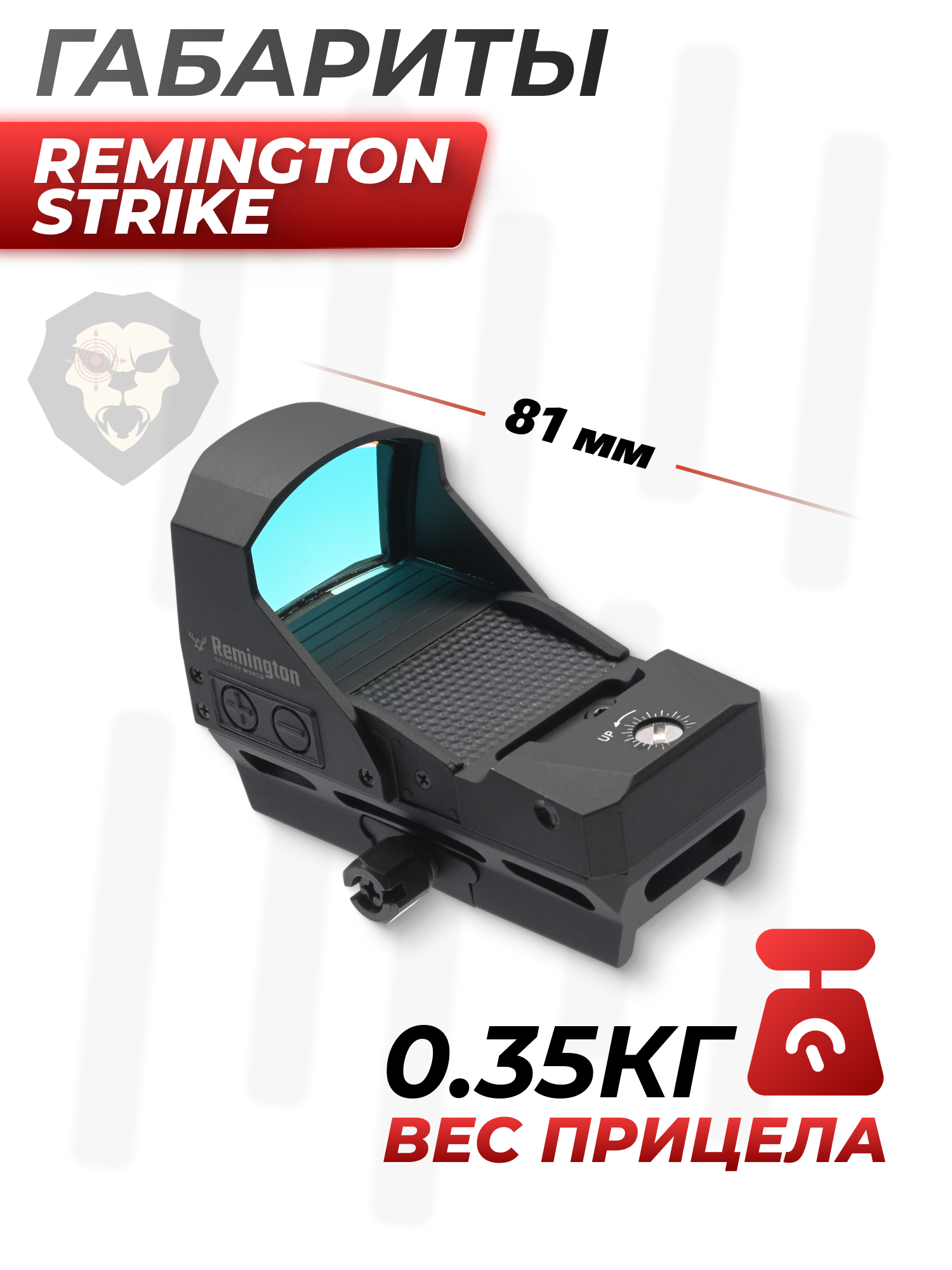Небезызвестный среди стрелков бренд Ремингтон кроме прочего наладил выпуск прицелов. Среди последних выделилась линейка открытых коллиматоров Strike. Модель отличилась открытой конструкцией - в этом случае окно, куда проецируется точка, всегда будет во внимании пользователя. Кроме того, решение помогло уменьшить массу и габаритные размеры - образец весит менее 350 грамм при высоте 19 мм и длине 81 мм.