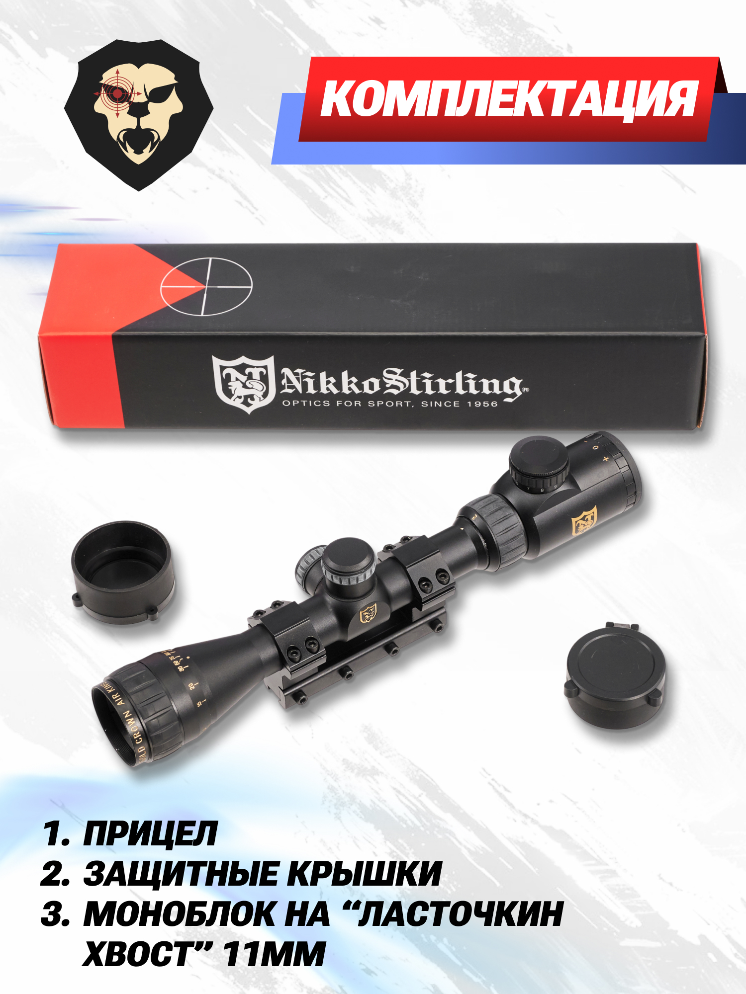 Прицелы бренда отличаются богатой комплектацией. Модель Nikko Stirling Airking, к примеру, поставляется в сборе с монолитным кронштейном на планку «Ласточкин Хвост» 11 мм. Вместо него можно использовать любые другие предпочитаемые кольца и моноблоки с диаметром посадки один дюйм.