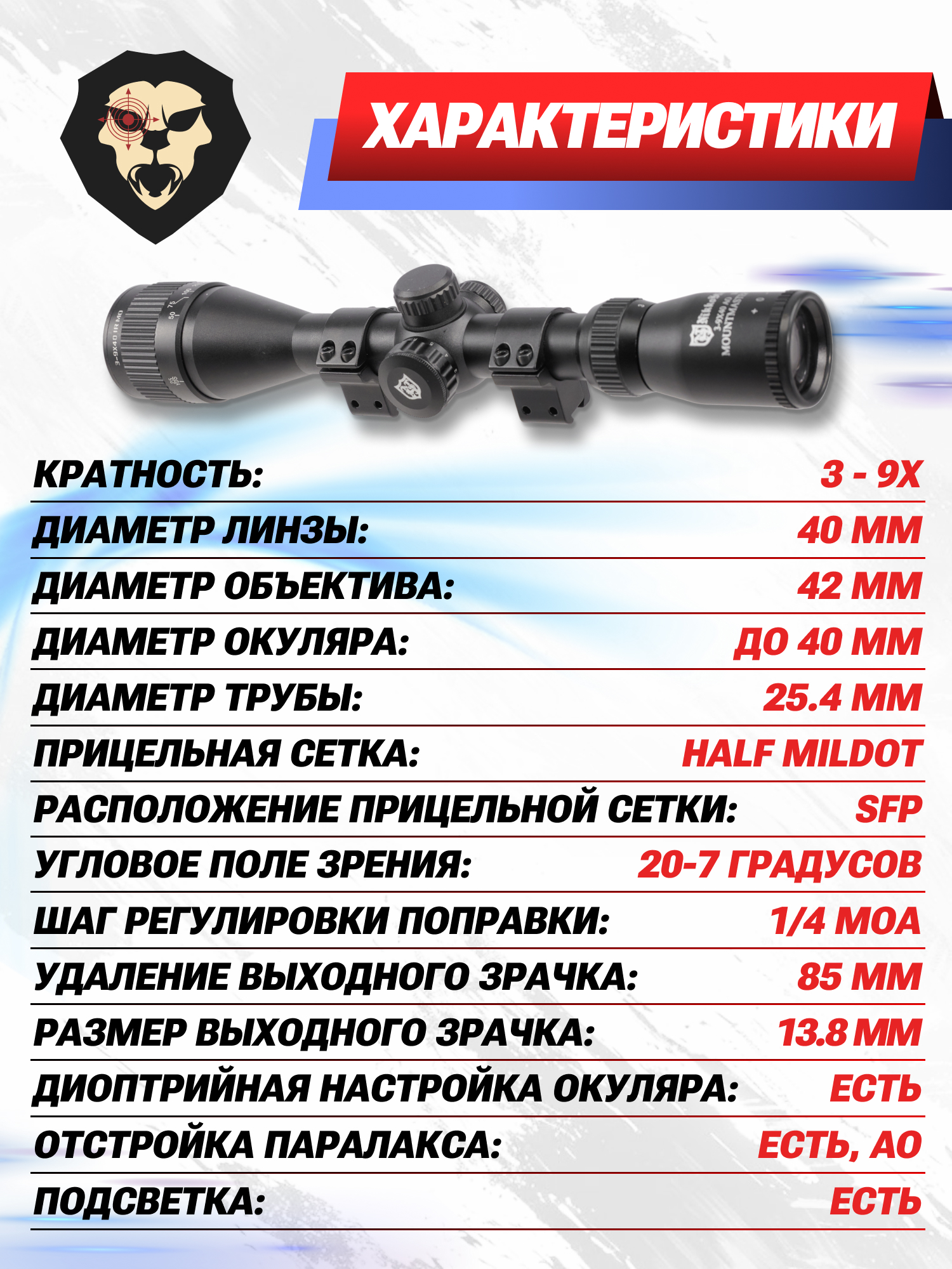 | Диаметр трубы прицела | 25.4 мм |