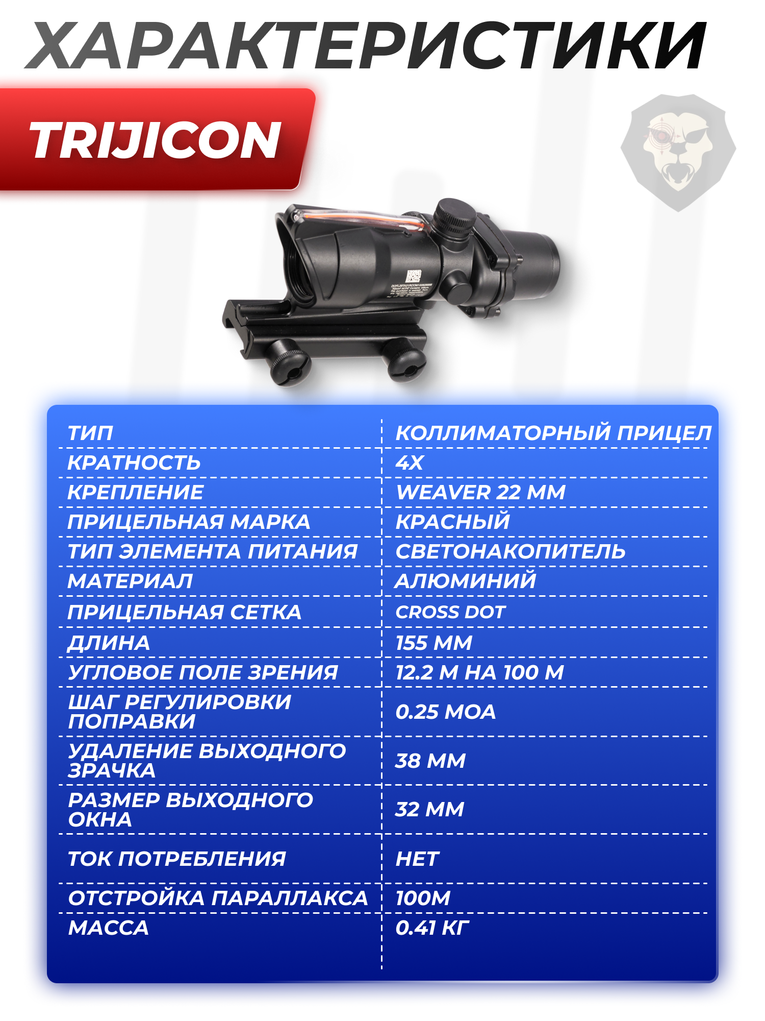 Информация о товаре "Призматический прицел Trijicon ACOG 4x32 (BH-KTR02)" носит ознакомительный характер, и не является публичной офертой, определяемой положениями Статьи 437 Гражданского кодекса Российской Федерации, характеристики, внешний вид, цвет и комплектация могут быть изменены производителем без уведомления.