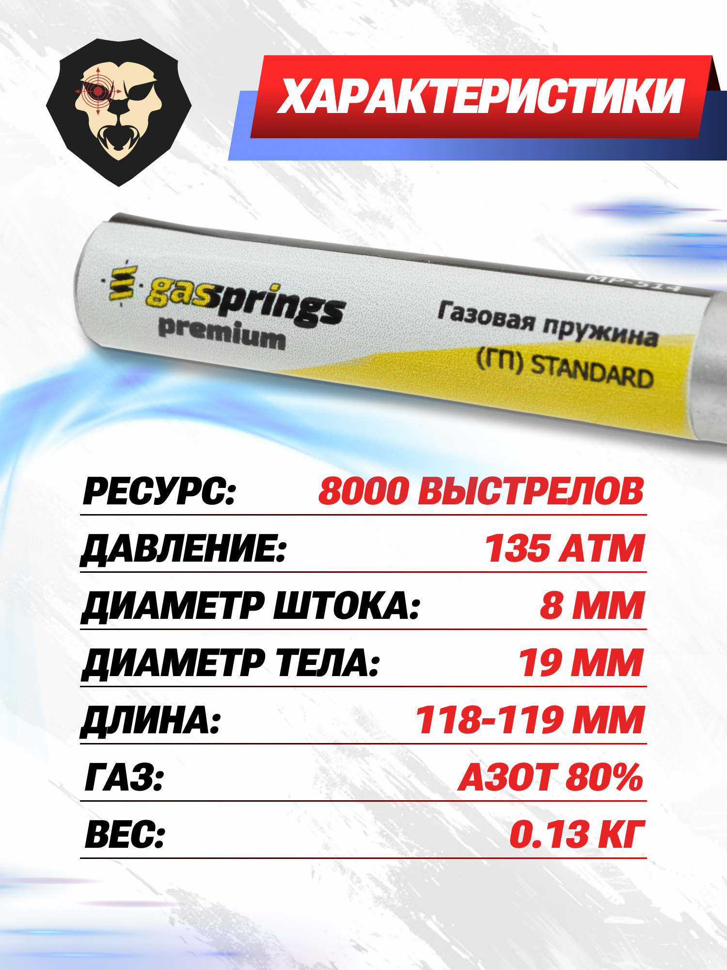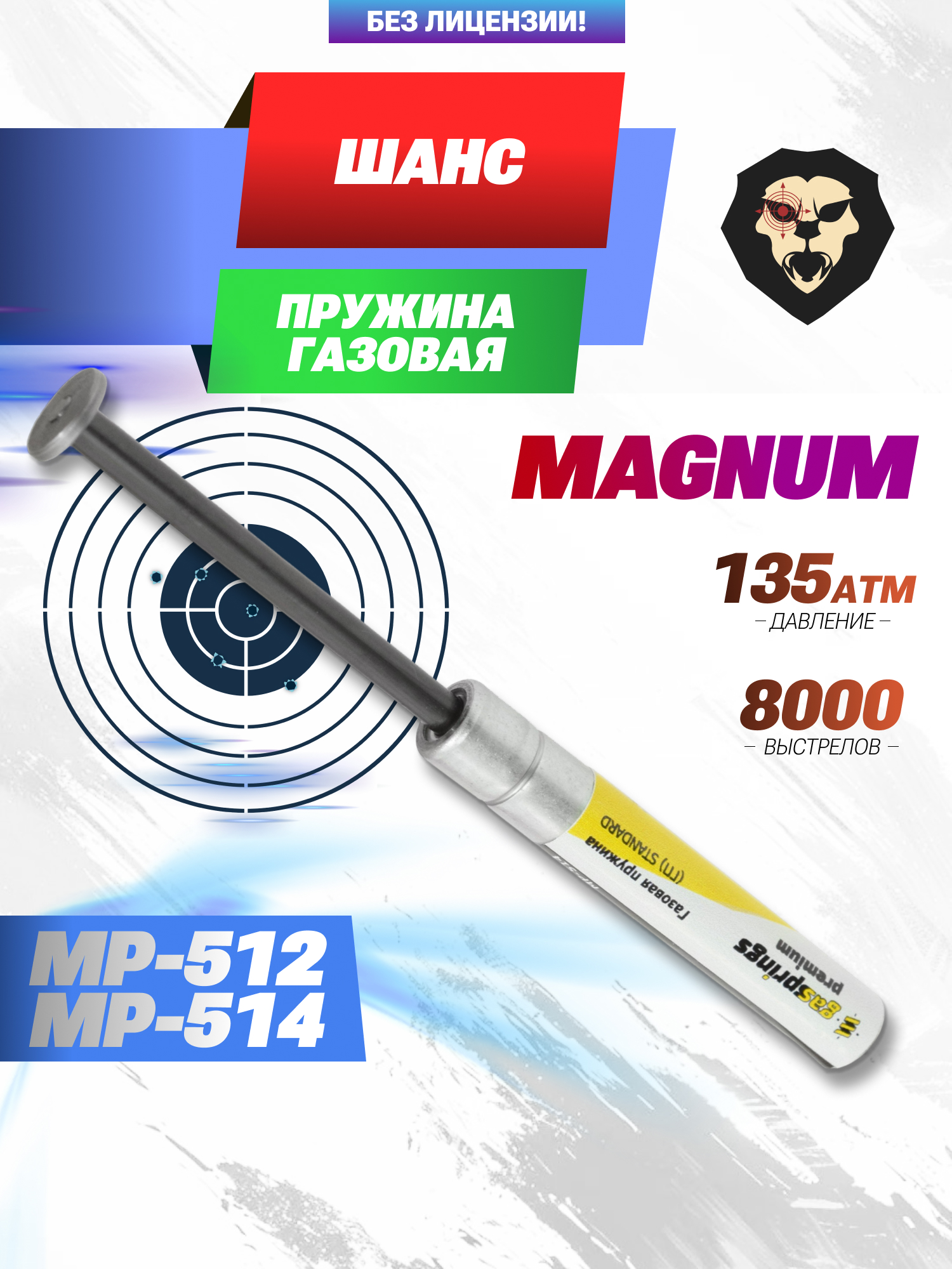 Газовая пружина на пневматическую винтовку МР 512 и 514 спроектирована под давление 135 атмосфер, ввиду чего изделие классифицируется как класс Magnum. Такое соотношение будет оптимальным для получения максимальной скорости без потери кучности.