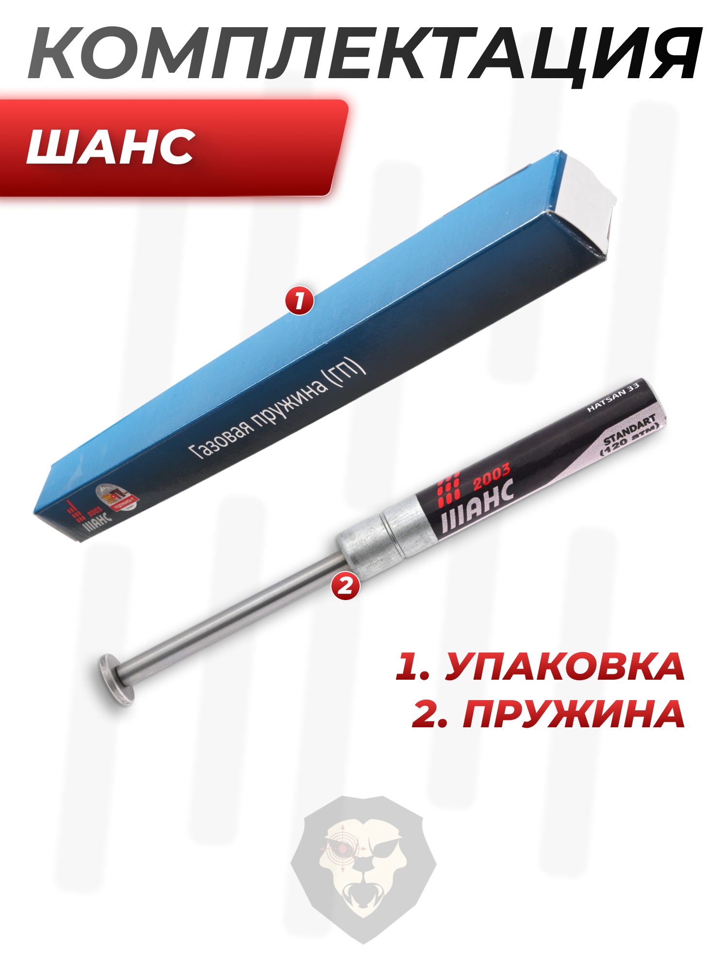 Пружина Шанс изготавливается в корпусе из стойкого к коррозии металла и заправляется азотом. Модель относится к категории Standart и воздействует на поршень компрессора с давлением в 120 Атм. Перед проведением модификации следует убедиться, что мощность винтовки останется в диапазоне разрешенных законом значений.