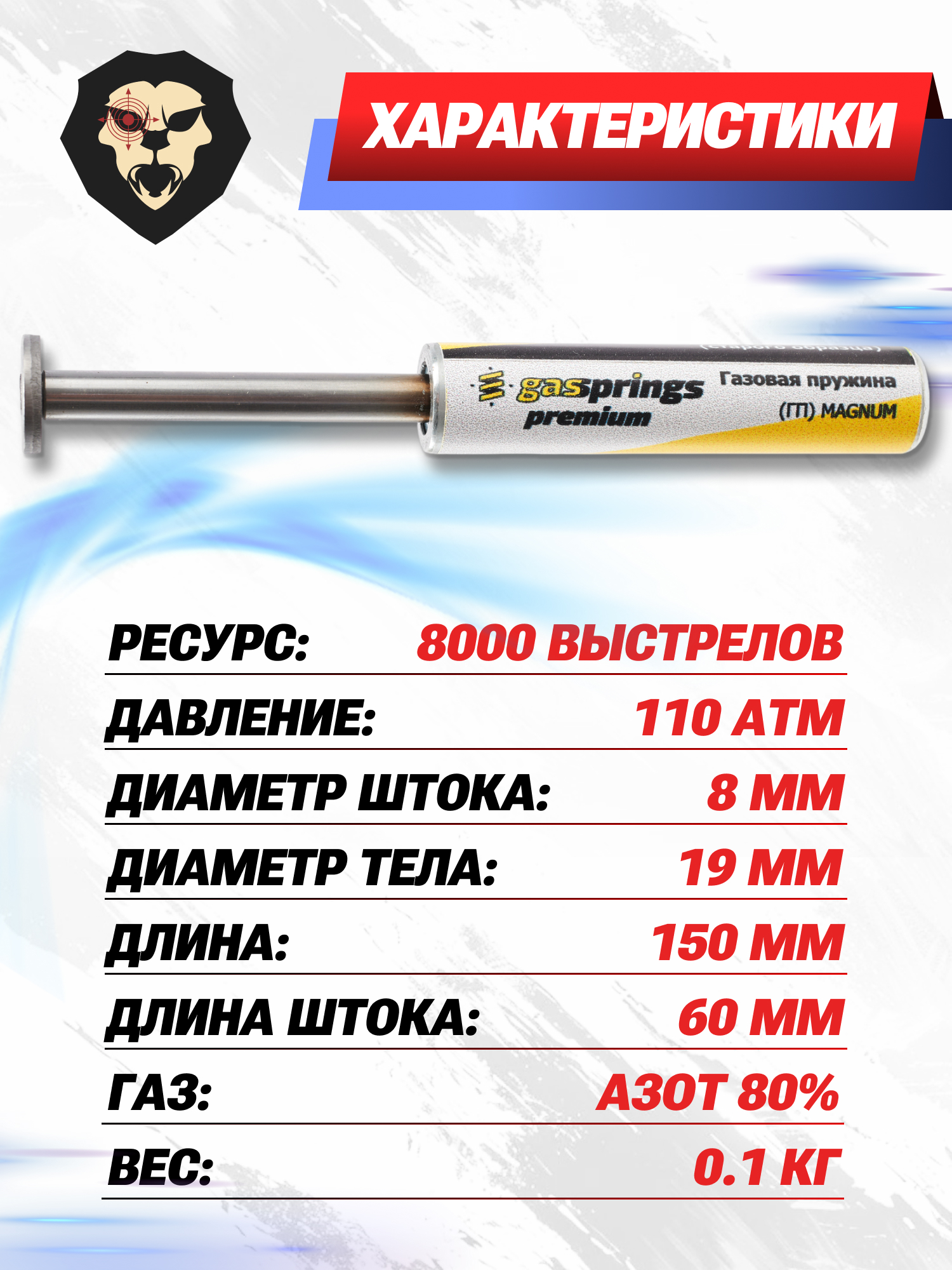 Газовая пружина Магнум выделяется большим рабочим ресурсом в количестве 8 тысяч эффективных выстрелов. 20-и миллиметровый цилиндр корпуса герметичен и не требует постоянной смазки. При использовании пневматики с модернизированной газовой пружиной важно соблюдать температурный режим до -15 градусов, для раскрытия полного потенциала устройства.