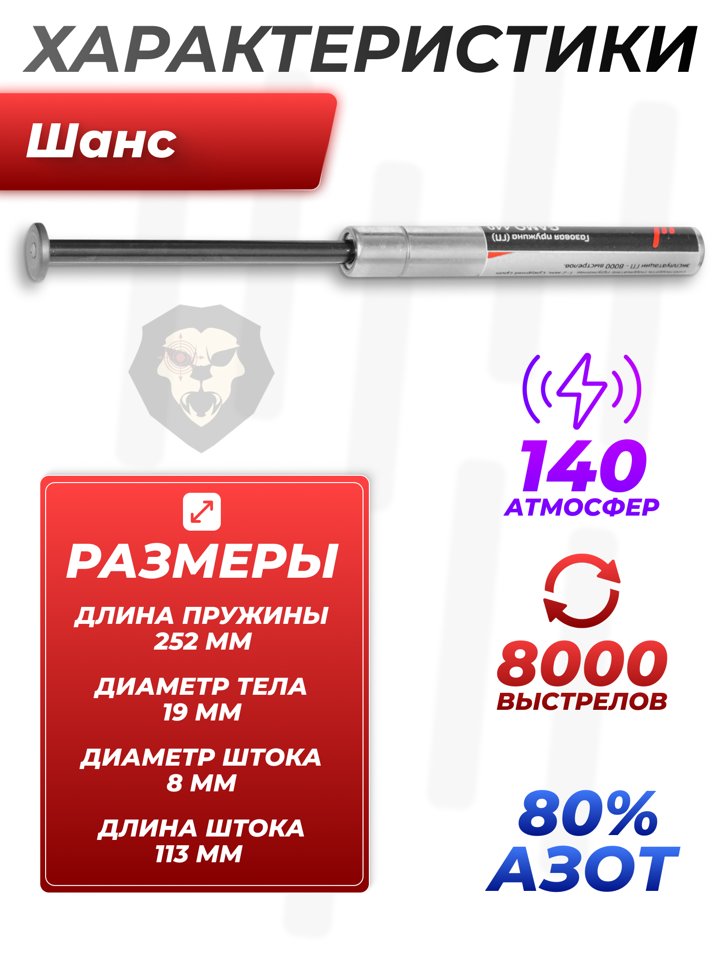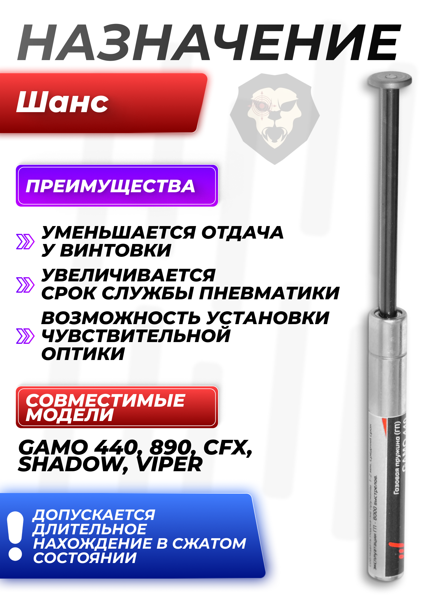 Шанс Gas Spring рассчитана на использование в пневматике испанского бренда Gamo. Пружина совместима с ППП винтовками модельного ряда 440 и 890, CFX, Shadow и Viper - установка выполняется на штатные посадочные места без необходимости в доработке конструкции «воздушек». Экземпляр выполнен в корпусе из металла, при этом корпус имеет размер 252 миллиметра, а шток - 113 мм.