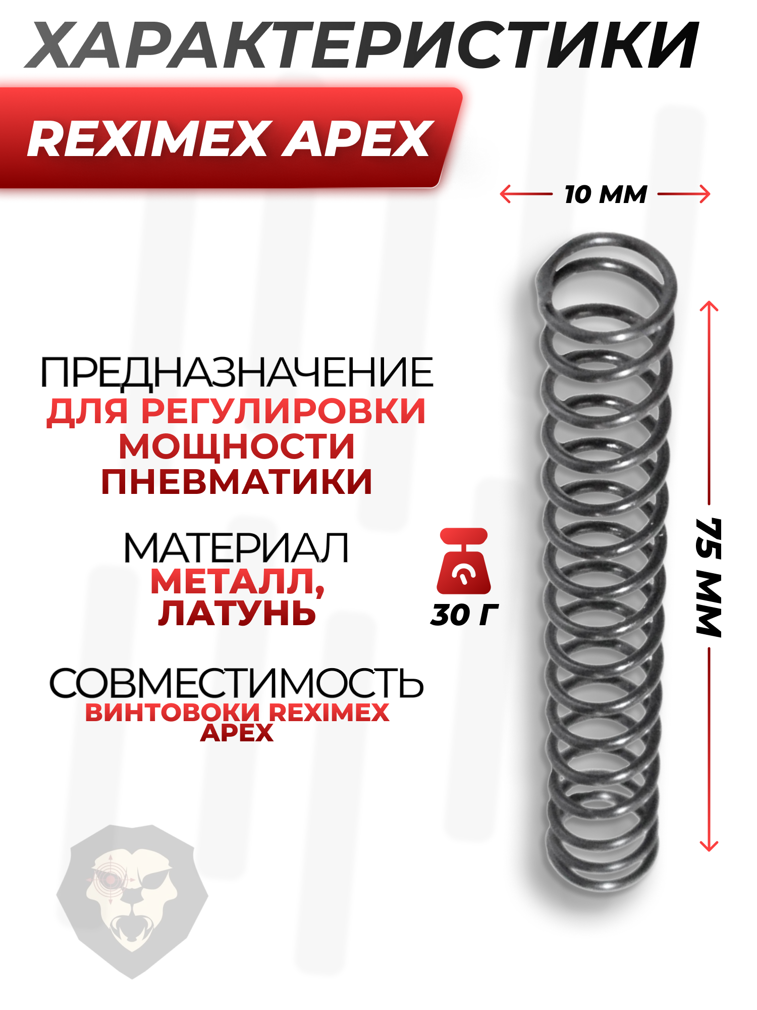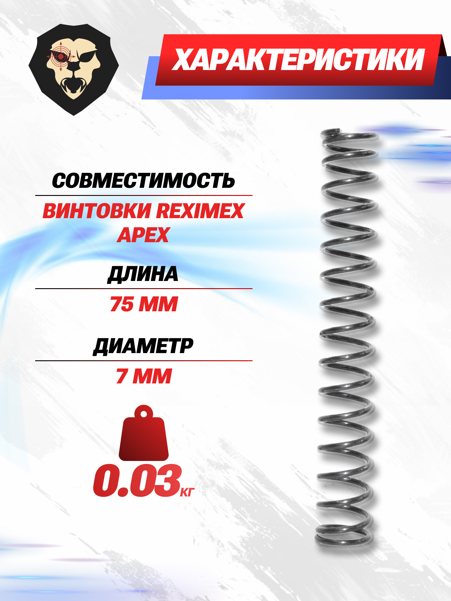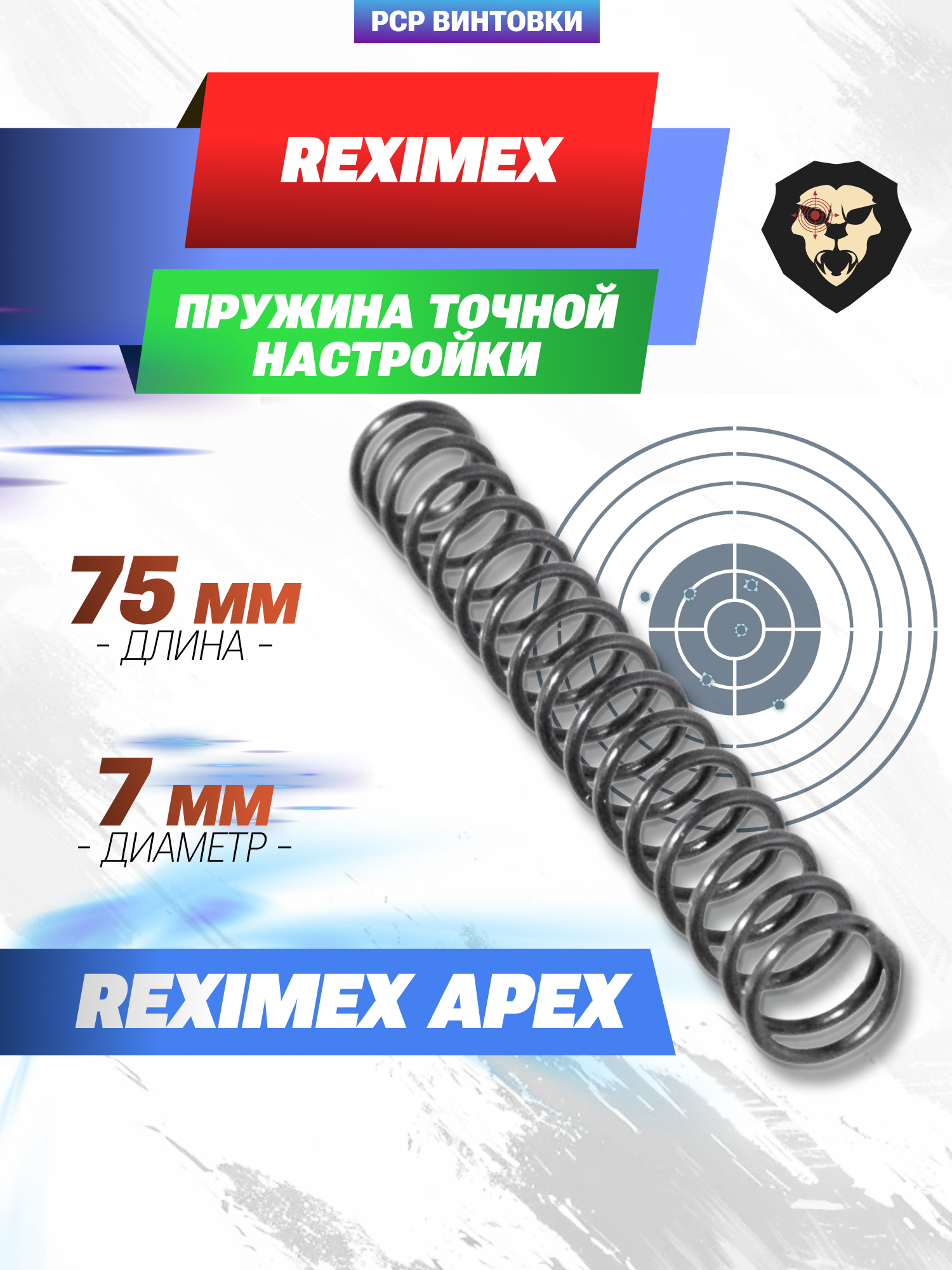 Известная в кругу любителей развлекательной стрельбы и охоты турецкая компания Reximex, помимо изготовления PCP винтовок, занимается производством необходимых ремкомплектов и запасных частей для регулярного ТО. Например, для точной настройки скорости движения ударника в пневматике серии Reximex фирма выпустила специальную витую пружину диаметром 7 мм. Усиленный элемент изготавливается из стальной проволоки, которая закручивается вокруг болванки и подвергается процедуре закаливания