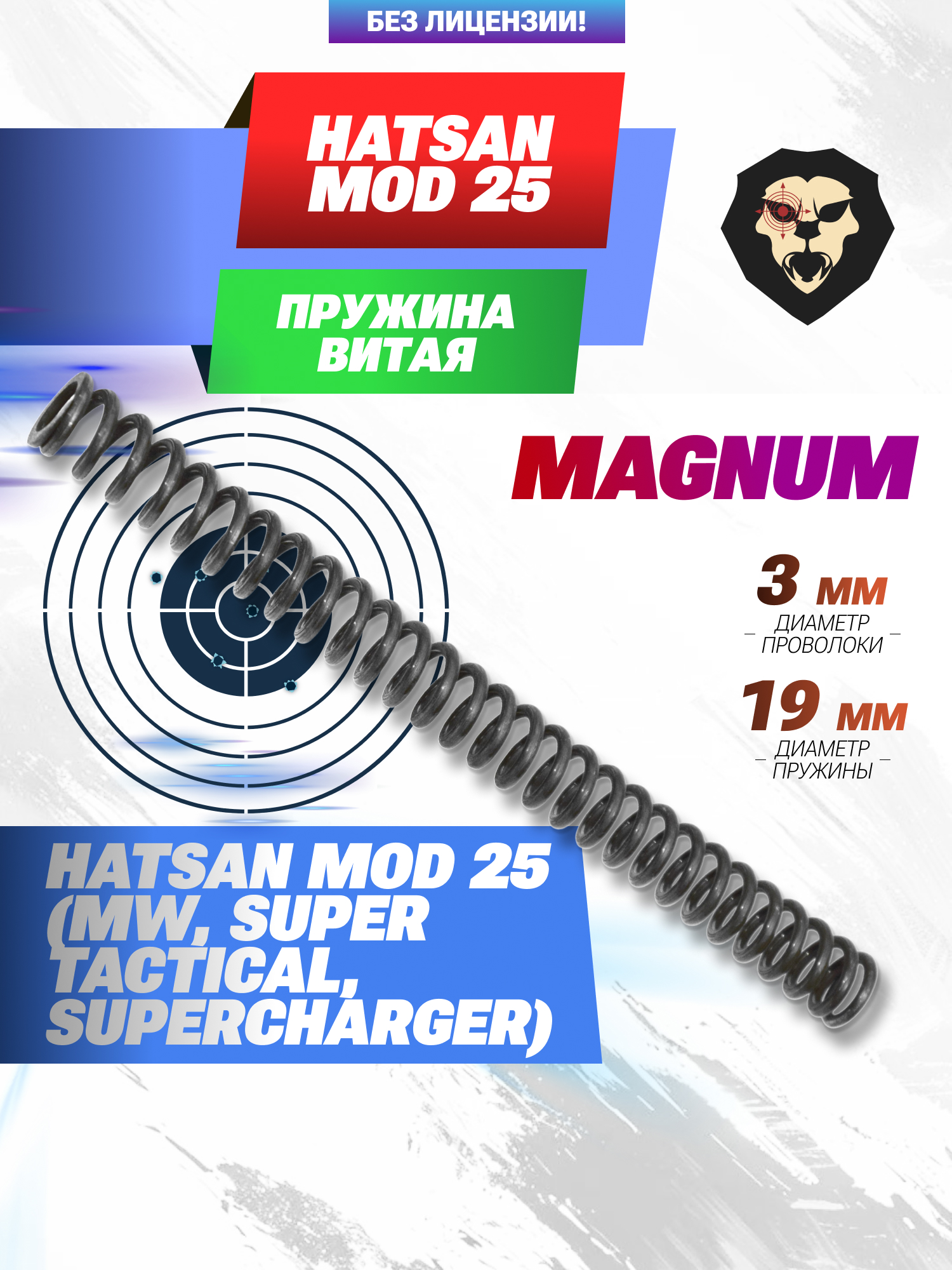 Усиленная пружина на Хатсан Мод 25 подходит как для стандартного исполнения, так и для модификации MW, Super Tactical, Supercharger. Изделие укомплектовано уплотнительной манжетой для использования в комплексе с этим экземпляром.
