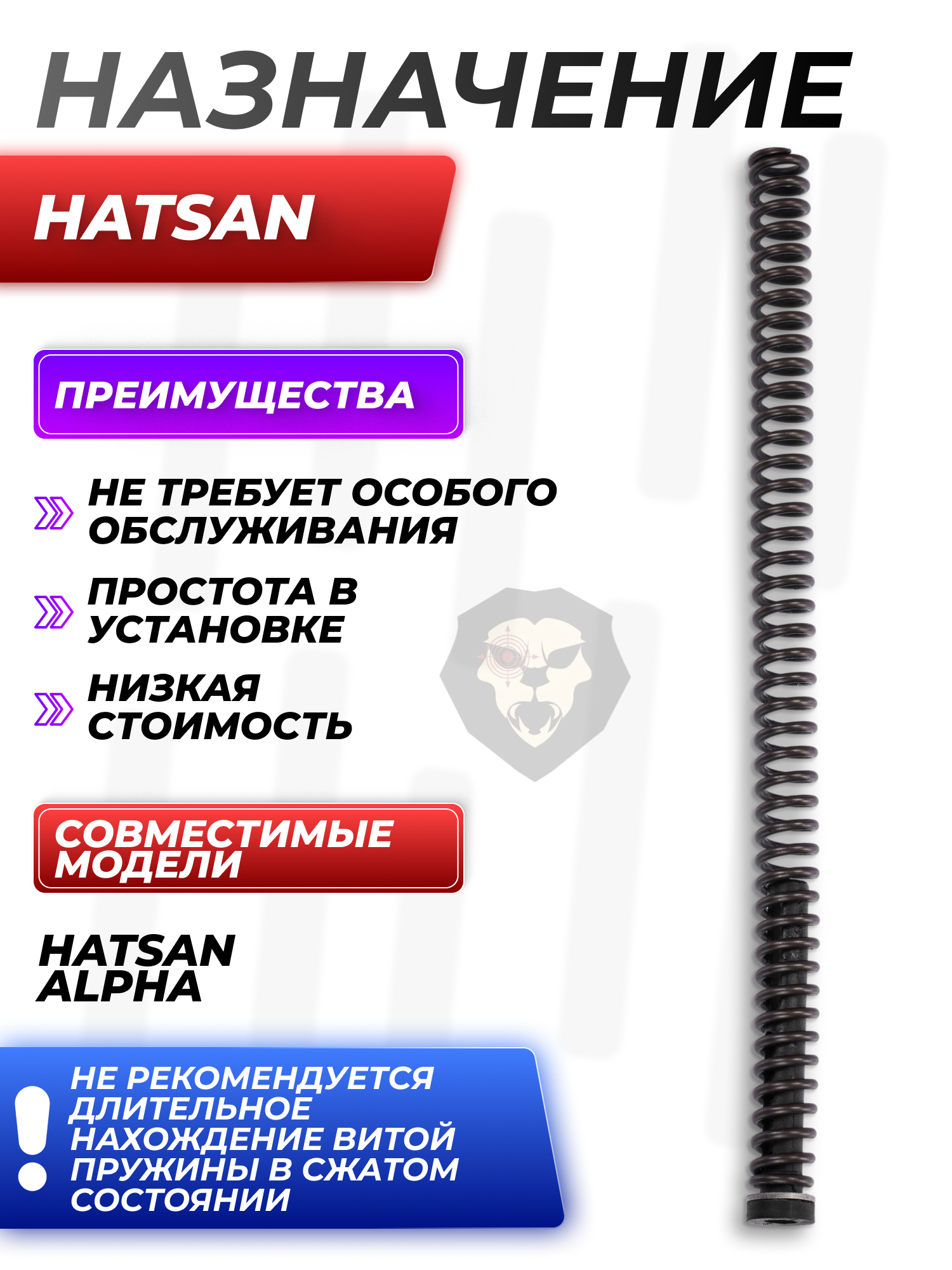 Геометрия компонента оптимизирована под штатные посадочные размеры пневматики Alpha от Хатсан. Концевые витки подвергаются термическому уплощению и шлифовке для предотвращения заклинивания в направляющей втулке. Процедура замены предусматривает разборку оружия с заменой манжеты.