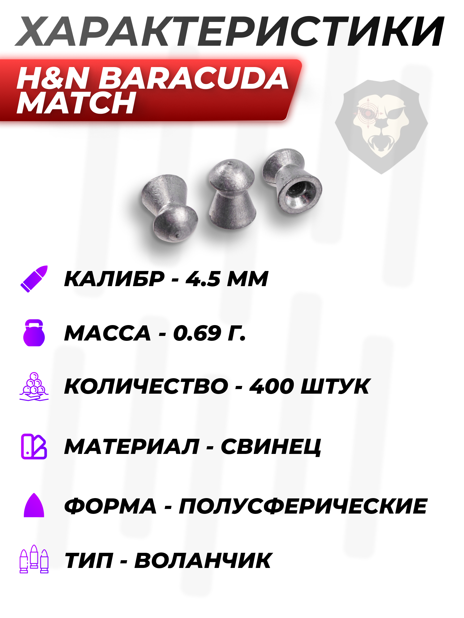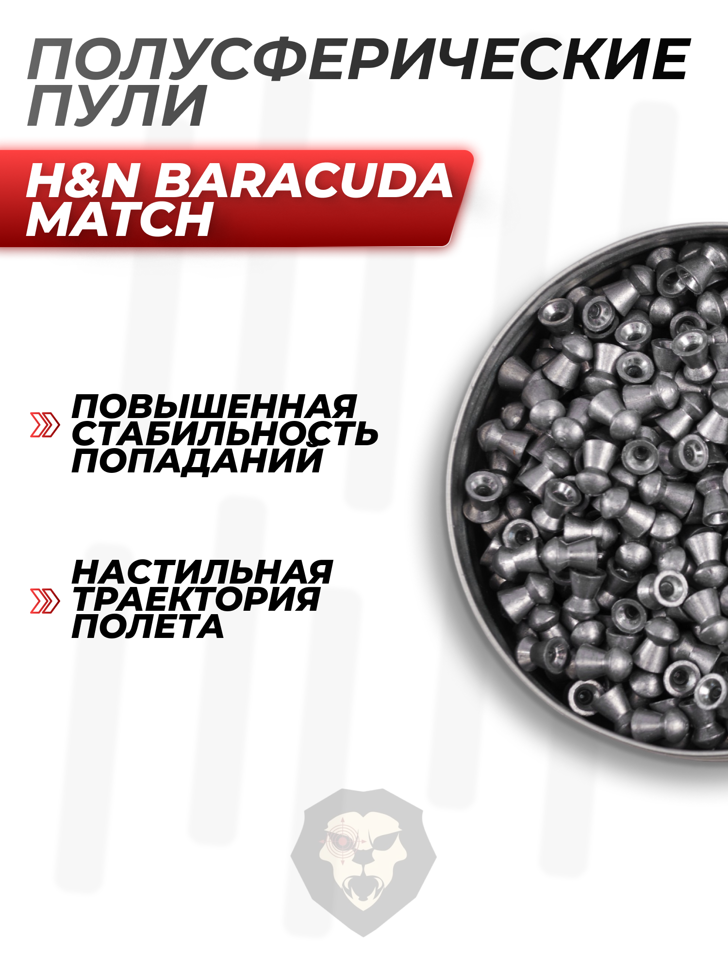 К перечню снарядов для пневматики из категории полусферических относятся рассматриваемые пули от ХиН из серии Баракуда Матч - в представленной поставке образцы совместимы с “воздушками”, нарезной бланк которых выполнен под калибр .177. Благодаря указанному формату исполнения головной части отмечается улучшенная аэродинамика снаряда.