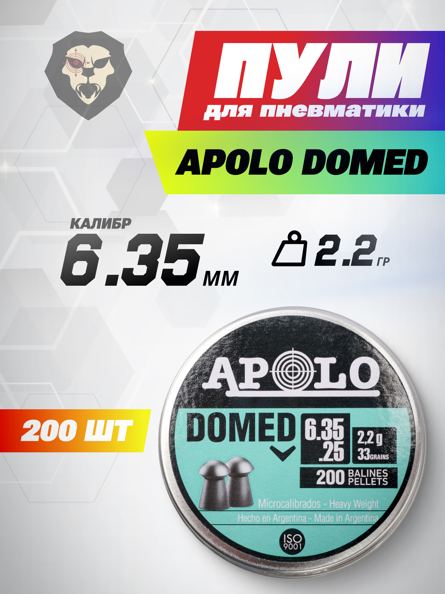 Пули пневматические Apolo Domed 6.35 мм (200 шт, 2.2 грамм) купить в интернет-магазине Popadiv10.