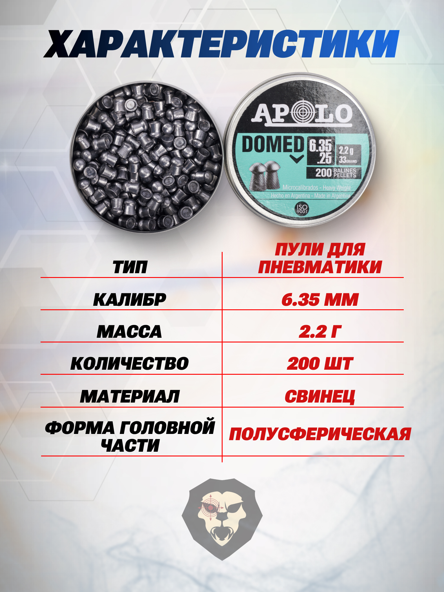 Мировые производители регулярно дополняют рынок снарядов для пневматики новыми образцами пуль. Компания из Аргентины Apolo занимается изготовлением боеприпасов повышенного качества и также регулярно пополняет ассортимент пульками различных видов и калибров. В этот раз аргентинский бренд выпустил пневматические пули Apolo Domed, применяемые с оружием калибра 6.35 мм.