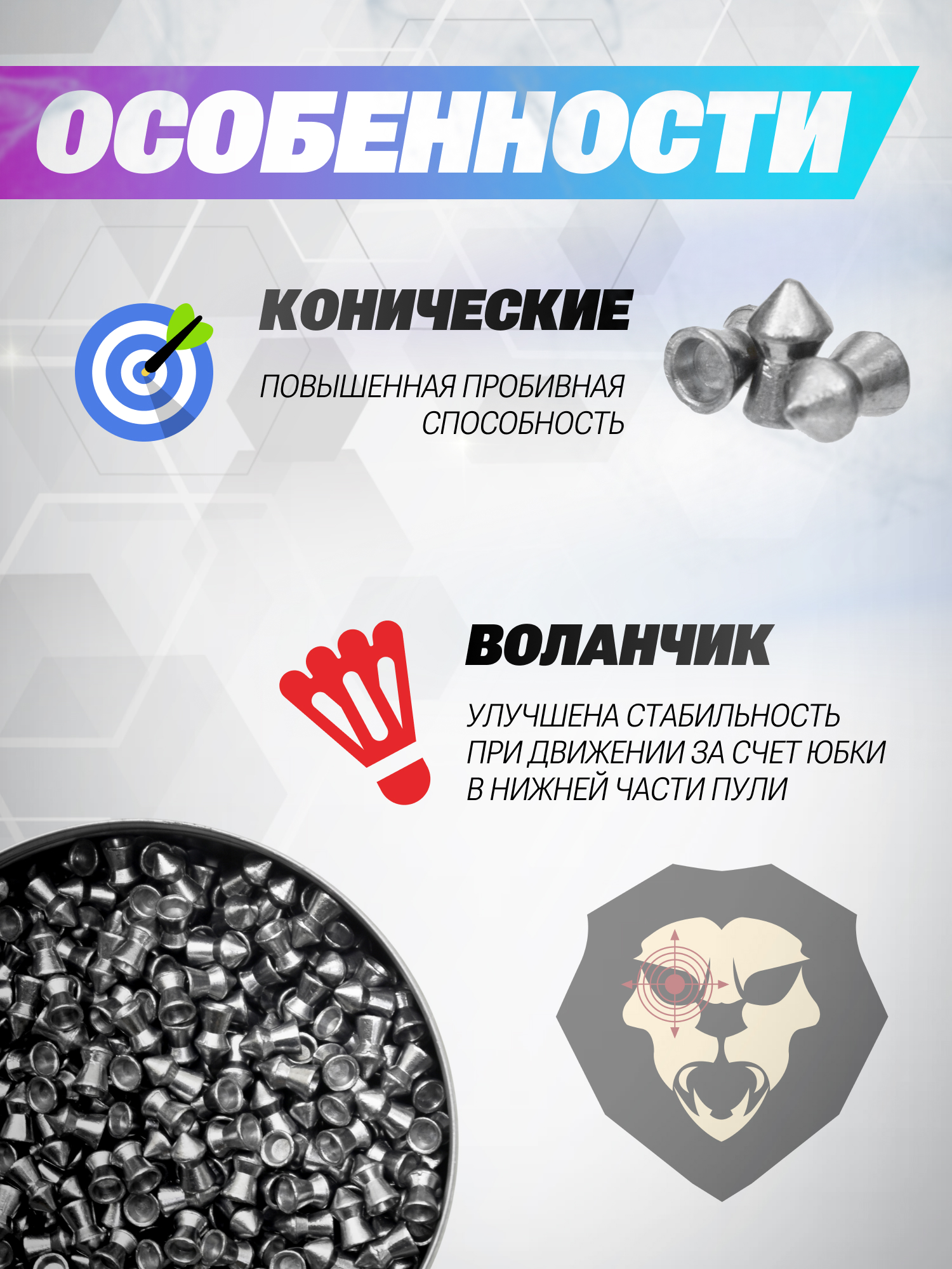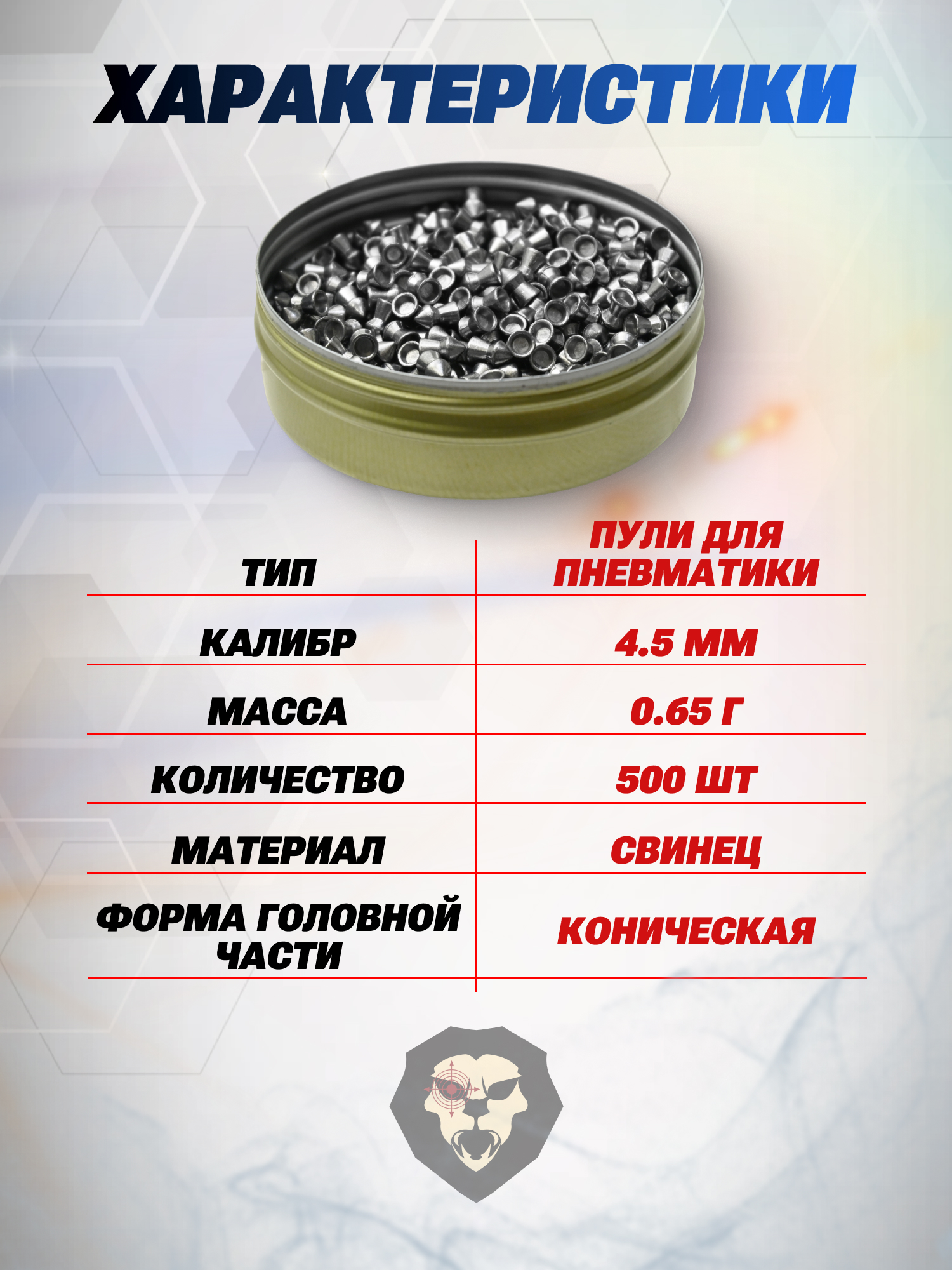 Применяются представленные пули Borner с воздушками калибра 4.5 миллиметра, а изготавливается каждый снаряд из свинца. Вес пульки при этом составляет 0.65 грамм.