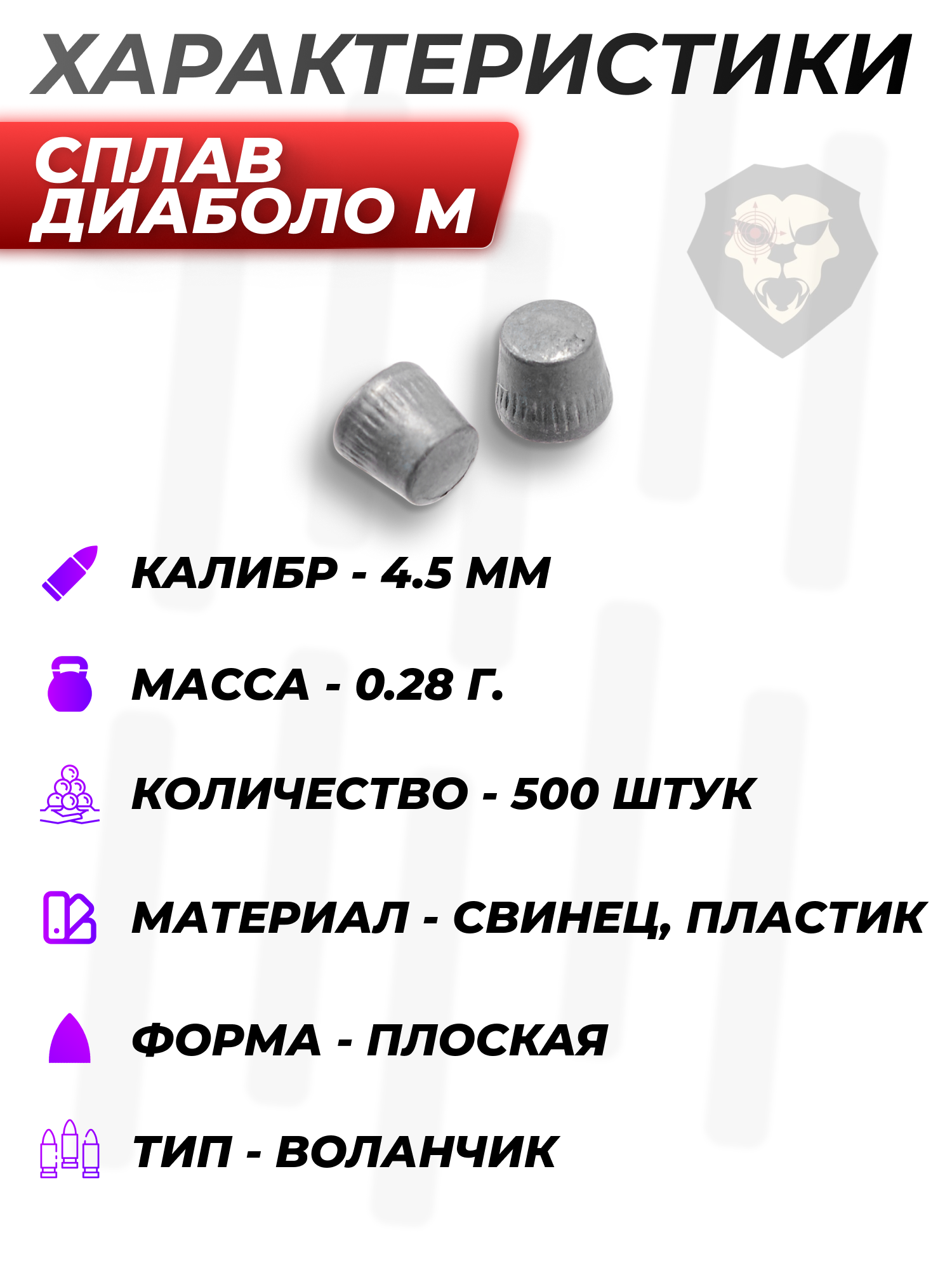 Сплав пули Диаболо имеют массу в 0.28 грамма и подойдут к пневматике калибром 4.5 мм, стреляющей свинцовыми боеприпасами. Таким образом позволяя использовать свинцовые снаряды от компании Сплав для развлекательной стрельбы или оттачивания навыка точности.