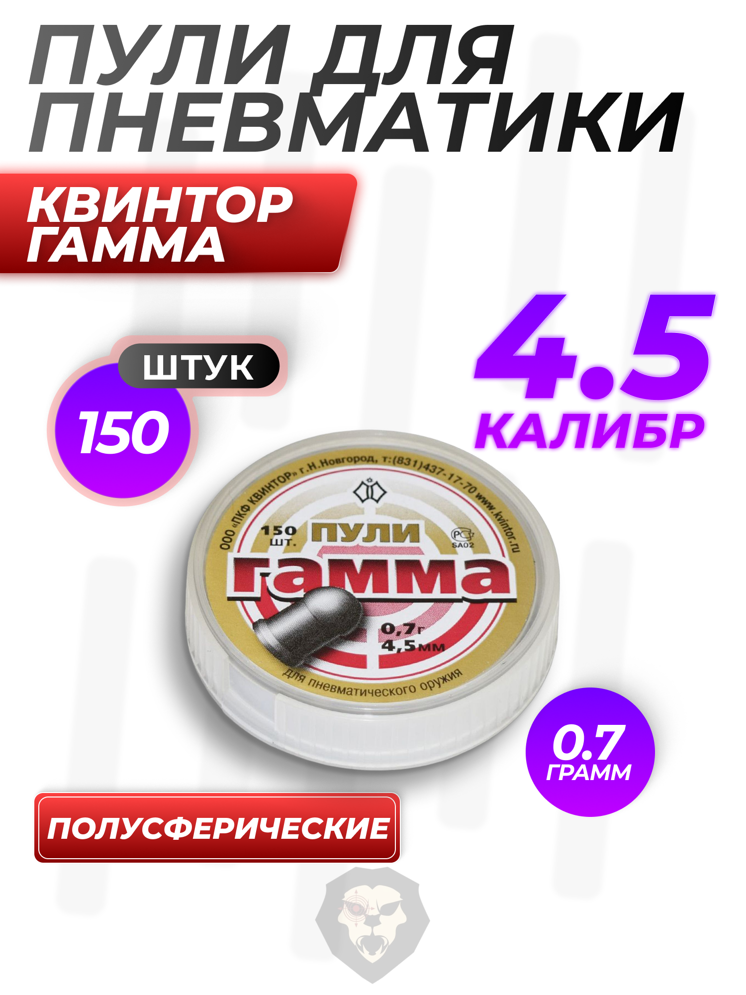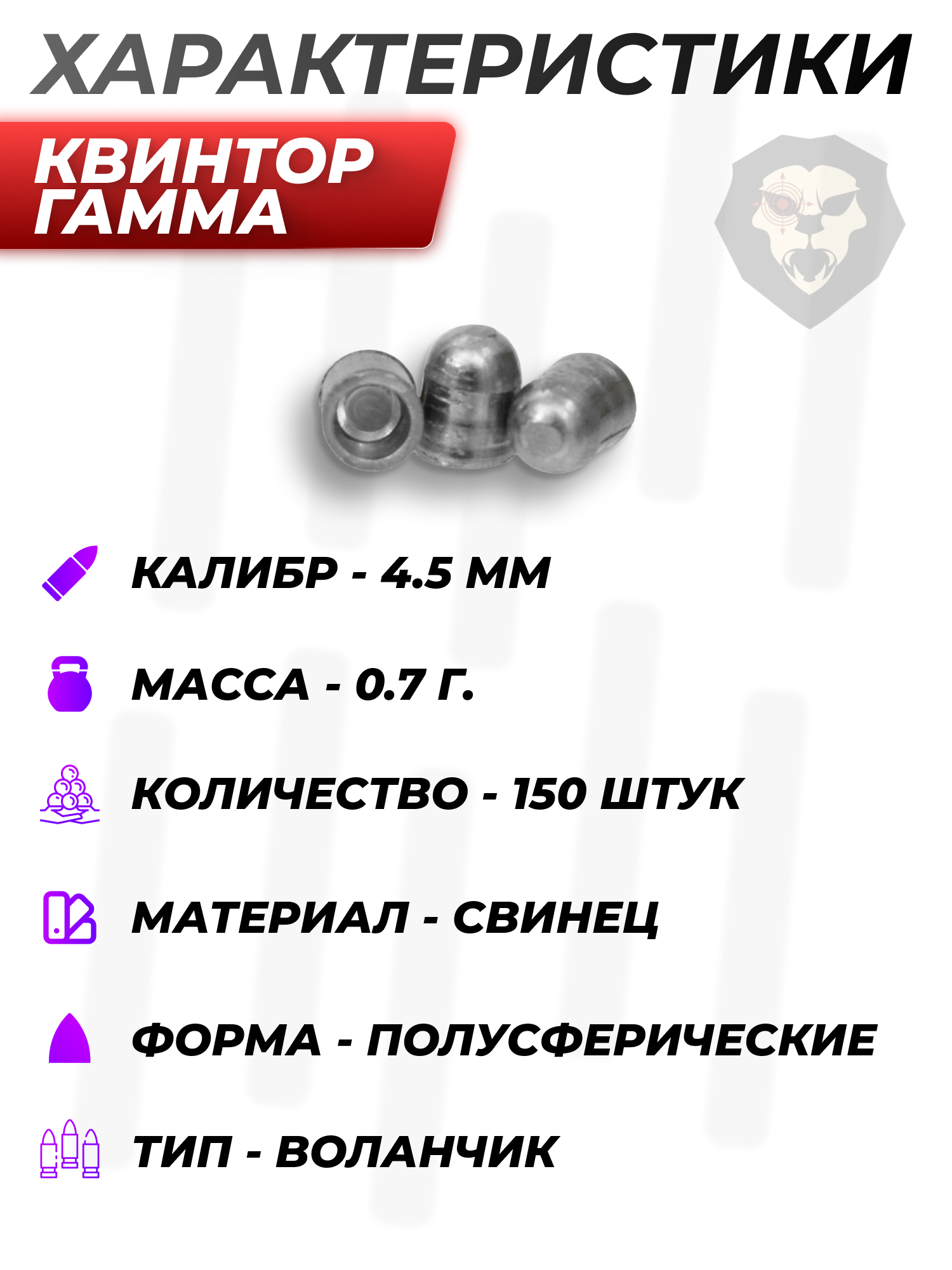Масса снарядов Квинтор 4.5 мм Гамма составляет 0.7 грамма, дальность полёта боеприпаса с таким весом достигает 55-60 метров. Поставляется производителем в пластиковой коробке вместительностью до 150 боеприпасов и разъёмом для подачи пульки.