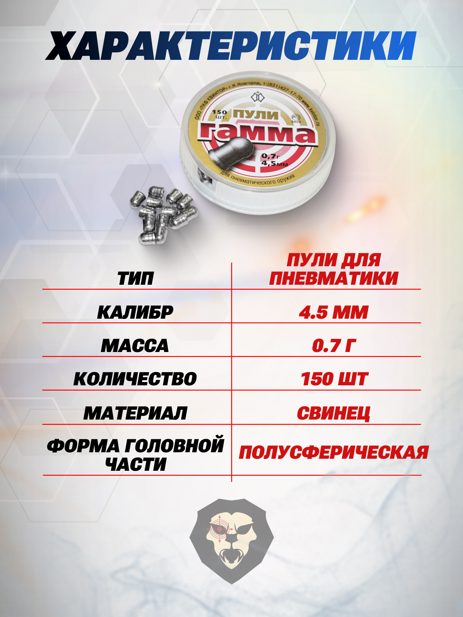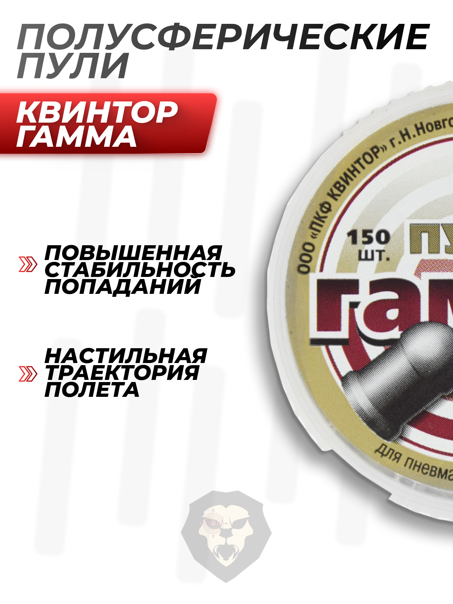 Пули для пневматики Квинтор Гамма изготавливаются из свинцового сплава под пневматику калибром 4.5 миллиметров. Боеприпас выполнен с полусферической головной частью, повышающей показатели аэродинамики пули и кучности на дальние расстояния.