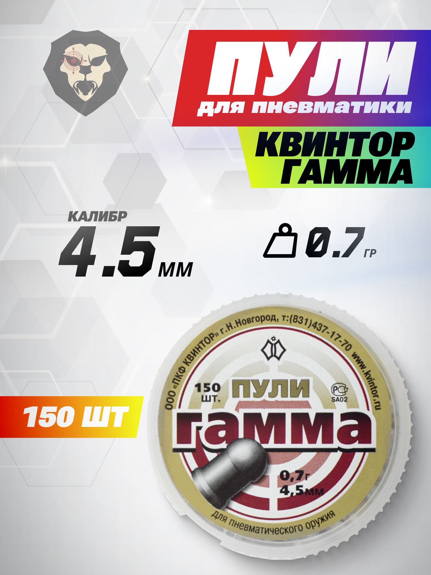 Информация о товаре "Пули пневматические Квинтор Гамма 4.5 мм (150 шт, 0.7 г)" носит ознакомительный характер, и не является публичной офертой, определяемой положениями Статьи 437 Гражданского кодекса Российской Федерации, характеристики, внешний вид, цвет и комплектация могут быть изменены производителем без уведомления.
