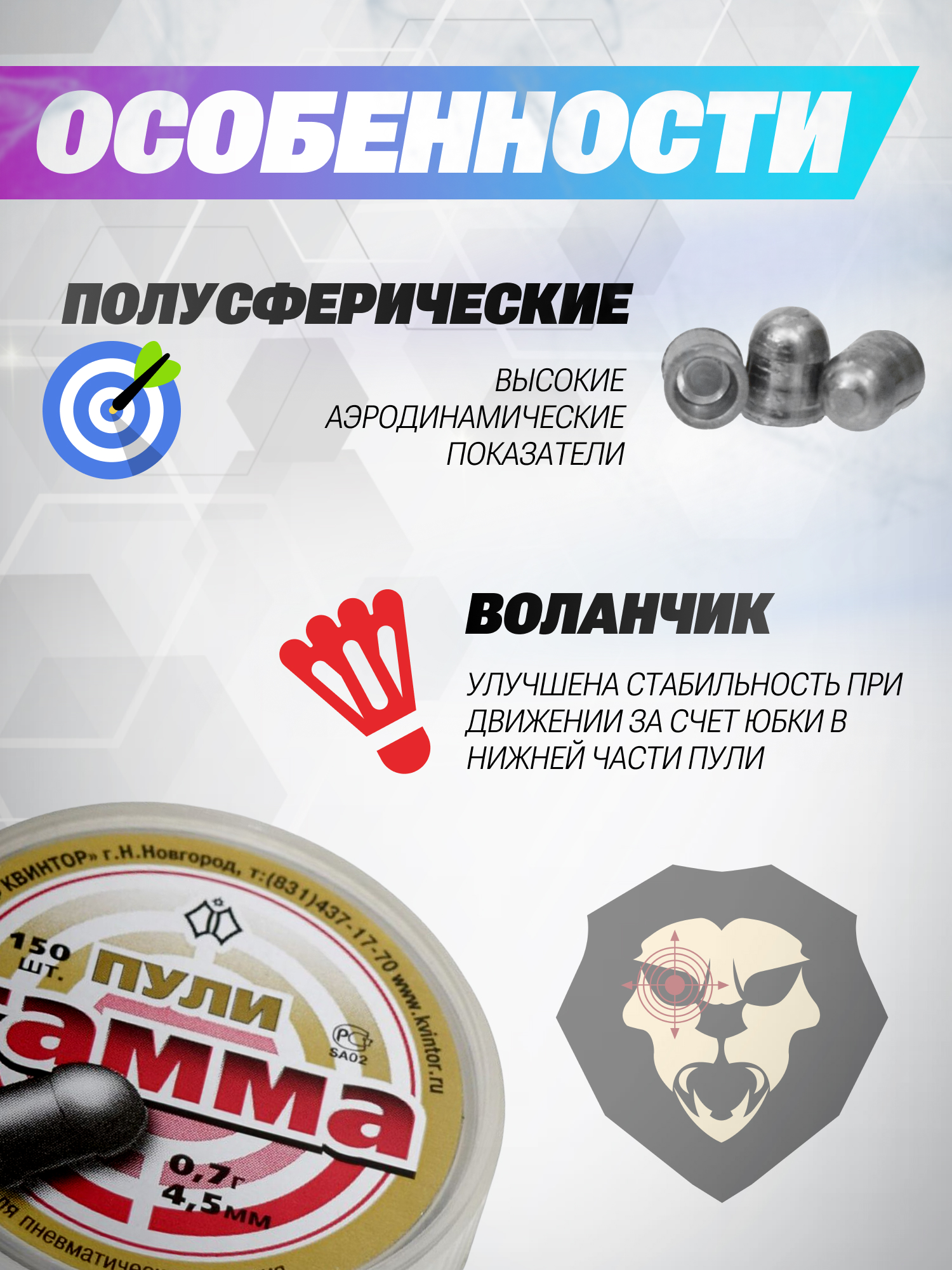 Компания Квинтор специализируется на изготовлении боеприпасов для пневматики и оборудовании для тиров. Располагая богатым опытом в производстве пуль для пневматического вооружения, бренд выпустил серию воланчиковых снарядов Гамма из свинца, которые рекомендуется применять в воздушках высокой мощности.