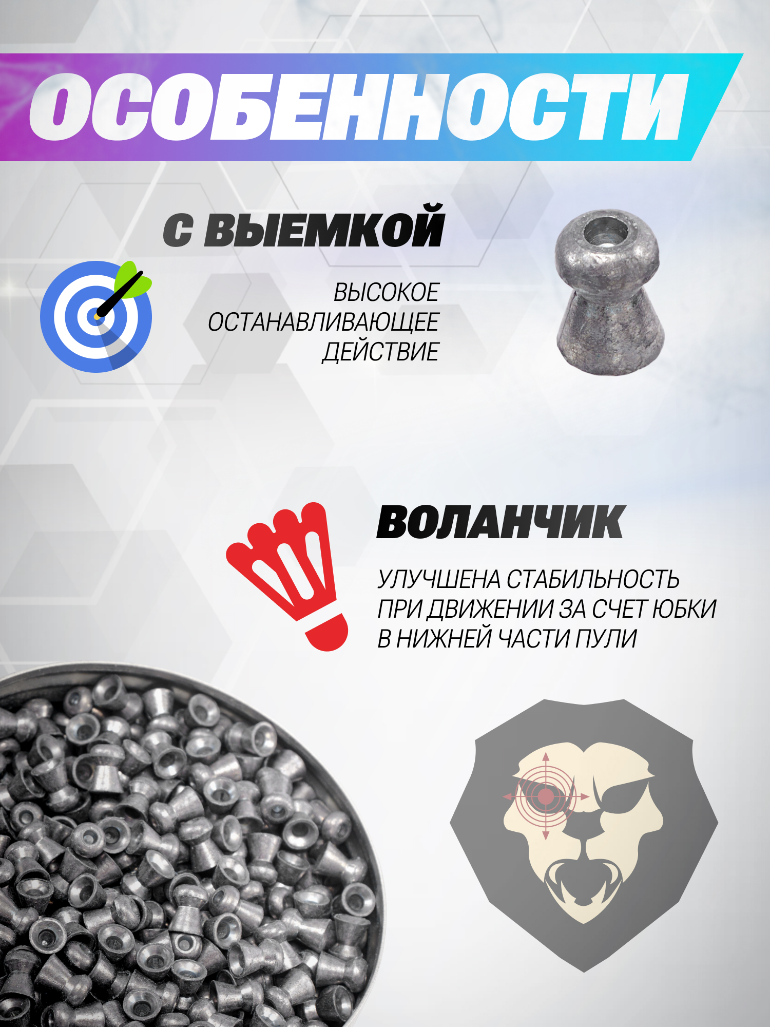 Снаряды рассчитаны на использование совместно с пневматическим оружием, оснащенным нарезным стволом калибром 4.5 мм. Отличительная особенность заключается в наличии выемки Hollow Point в головной части. Благодаря этому при попадании пуля Баракуда Хантер равномерно деформируется с увеличением площади поражения - как следствие, повышается останавливающее действие из-за максимальной передачи энергии.