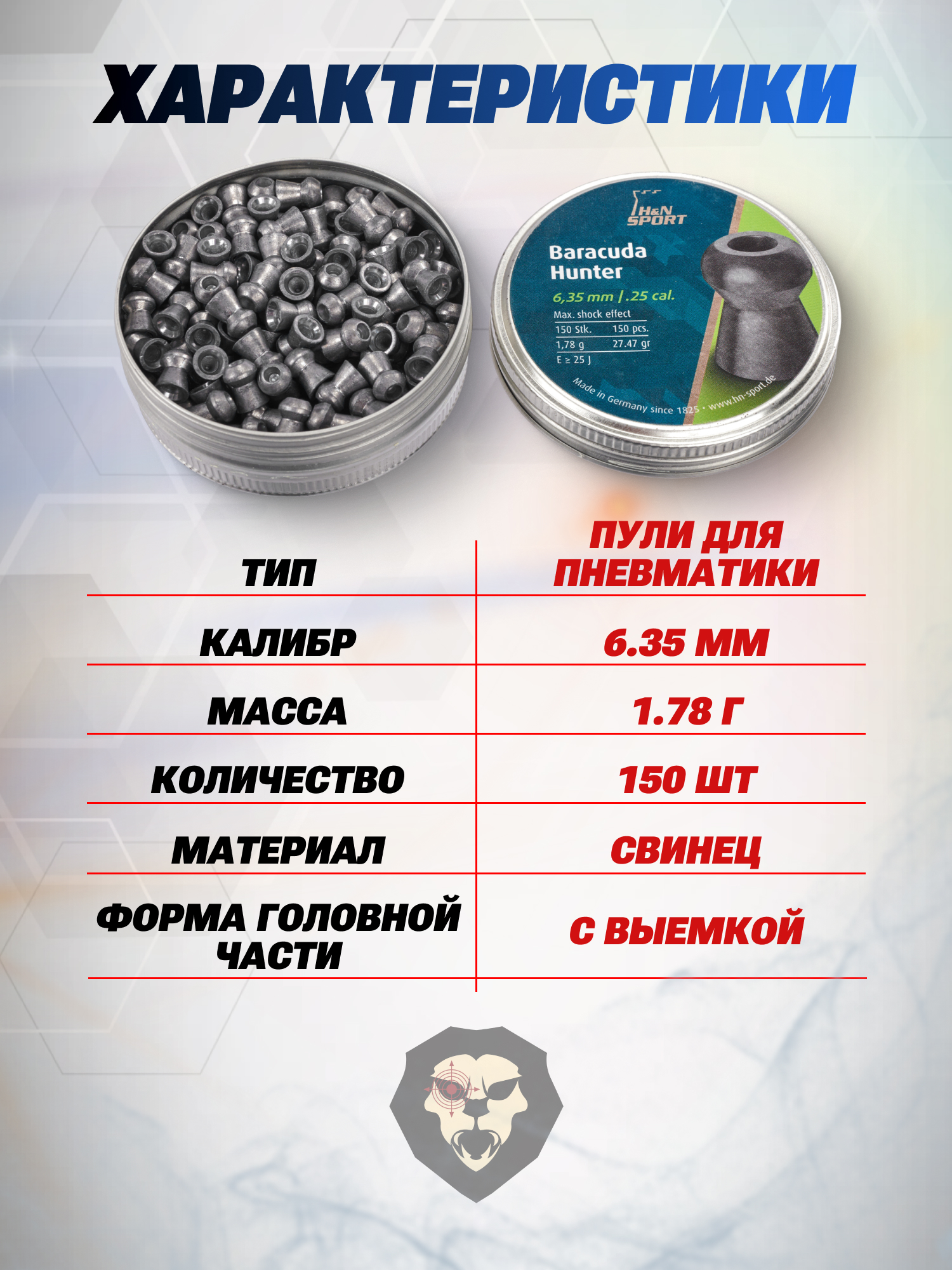 Рассматриваемые снаряды заимели повышенную популярность среди охотников, держащих в своем арсенале воздушки калибра 6.35 мм. Пульки Баракуда Хантер обладают полусферической формой с выемкой и отличаются увеличенными показателями аэродинамики и начальной скорости полета. Изготавливают такие боеприпасы из свинца, что обеспечивает понижение степени износа стальных стволов. Утяжеленные 1.78-граммовые пули H&N на российский рынок пневматики поступают в металлических баночках по 150 единиц снарядов.