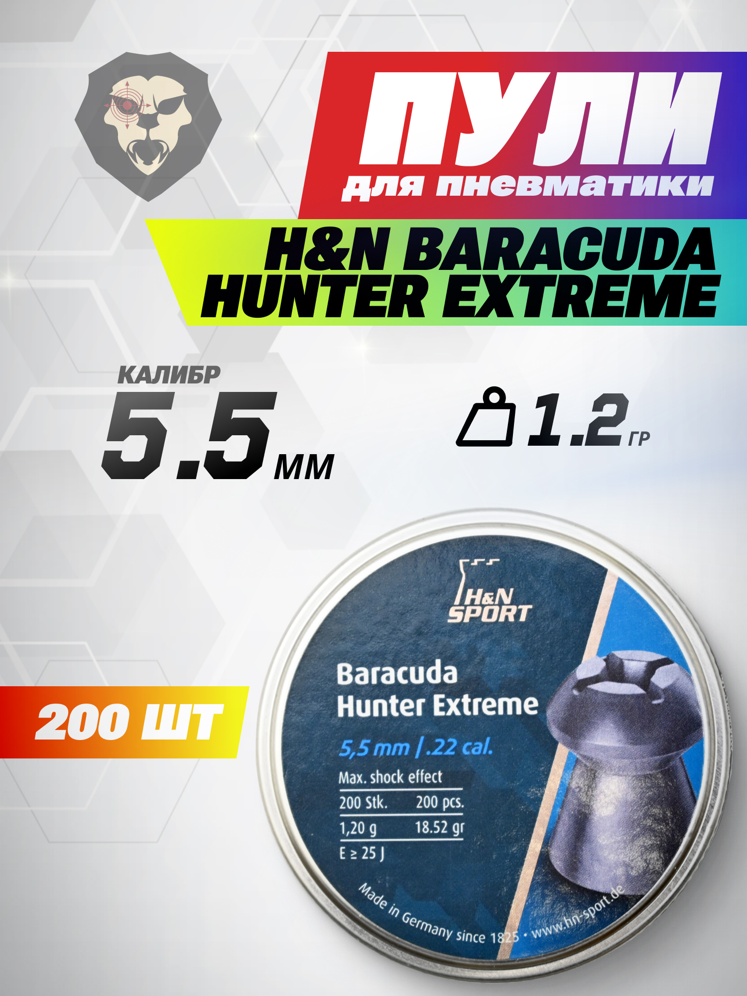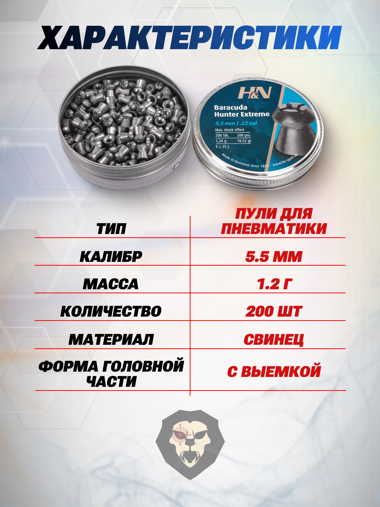 В коллекции товаров иностранной фирмы представлена обширная коллекция всевозможных типов снарядов под разные задачи. В указанный ассортимент компании входят обозреваемые пули H& N Baracuda Hunter Extreme, предназначенные для моделей пневматических винтовок в калибре 5.5 миллиметров. Изготовитель обращает внимание пользователей на то, что масса каждого боеприпаса составляет 1.2 грамма и для наибольшей результативности выстрела рекомендуется применять снаряды совместно с образцами пневматического оружия, классифицирующимися как магнум-пневматика для охоты.