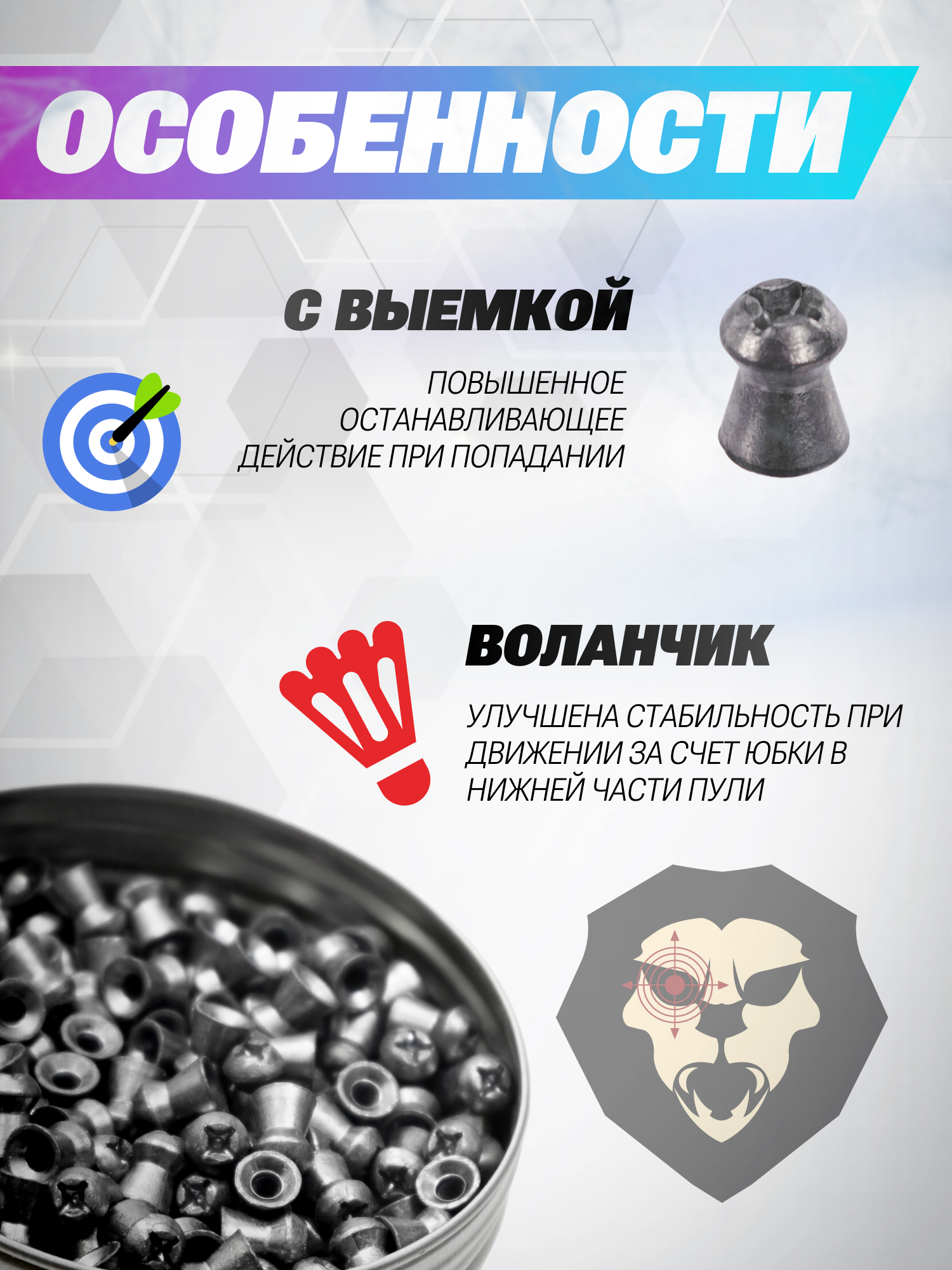 Главной особенностью описываемых пуль для пневматики является наличие крестовидной прорези головной части снаряда, которая обеспечивает повышенное останавливающее действие за счет мгновенной передачи энергии при попадании. Указанная деталь в сочетании с упомянутой массой позволяет применять рассматриваемые снаряды для охоты на малую и среднюю дичь, например, зайцев, лис или водоплавающих птиц.
