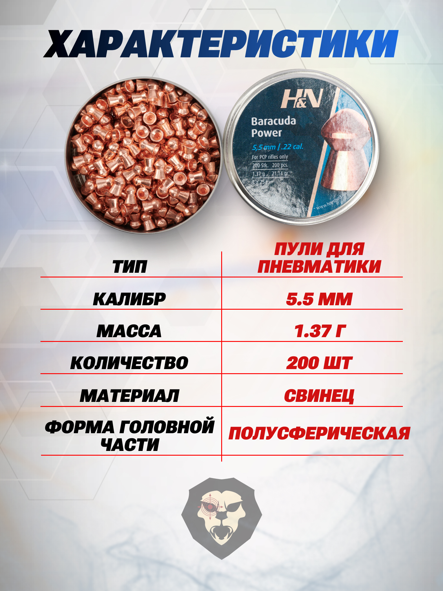 Пули H&N Baracuda Power обозреваемого образца совместимы с пневматикой калибра 5.5 мм. Они выпускаются в металлическом кейсе - емкость круглой приплюснутой баночки составляет 200 снарядов. Благодаря наличию плотно закрывающейся крышки предотвращается проникновение внутрь влаги при хранении или во время транспортировки.