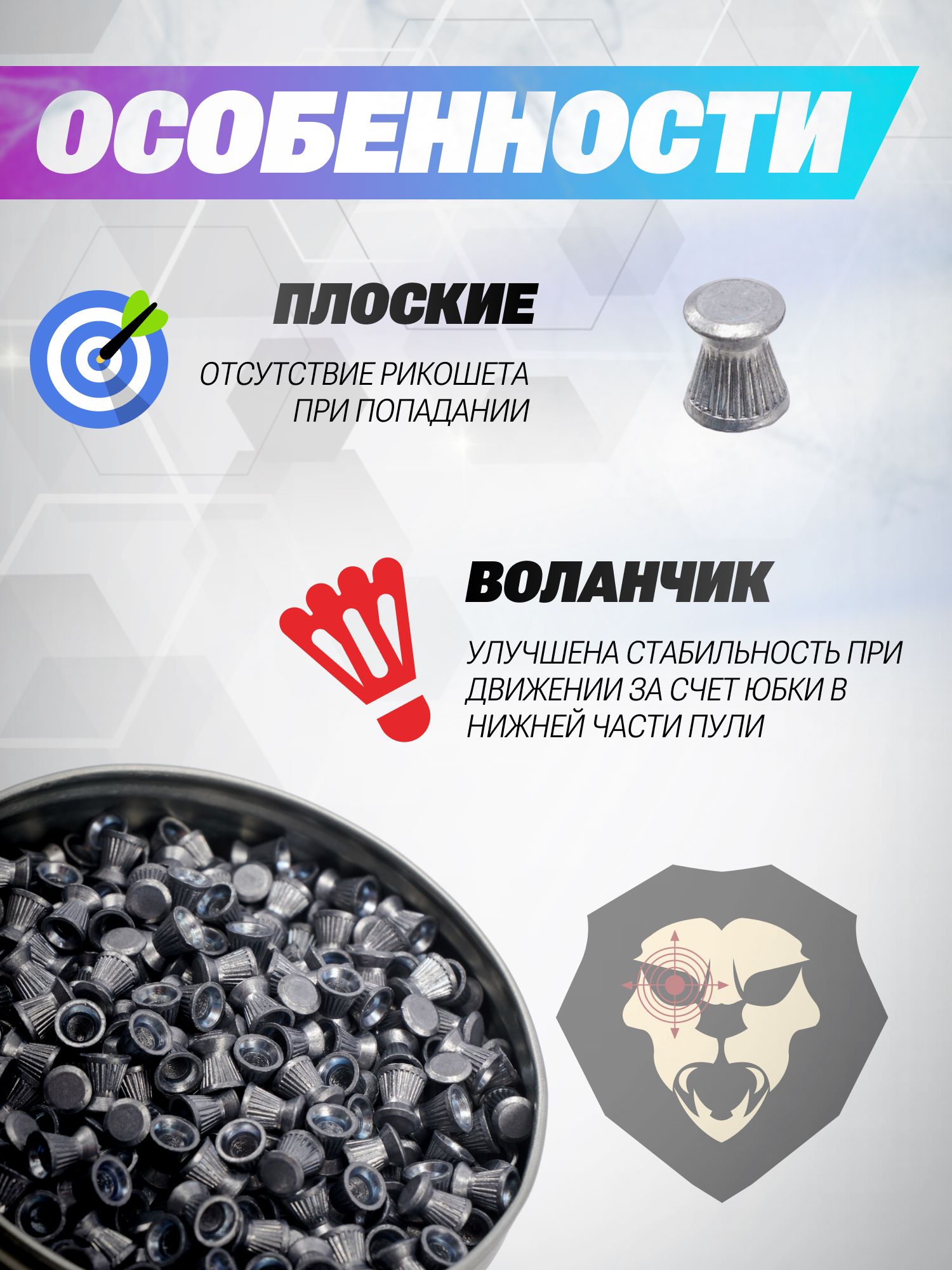 Пули характеризуются юбочкой с рифлением и плоской передней частью боеприпаса. Такая форма не позволяет пуле «срикошетить» при достижении пулькой цели, а также в месте попадания оставляется ровная отметина.