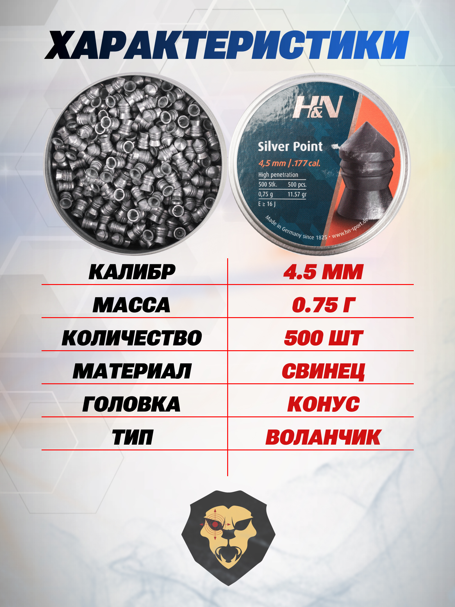 Свинцовые заряды на рынке отличаются некоторыми характеристиками - весом, калибром и форматом исполнения головной части. Рассматриваемые снаряды Silver Point от указанного ранее производителя предназначаются для эксплуатации с пневматикой, которую изготовили под калибр 4.5 миллиметра. Голова выполнена в конической форме, то есть с заостренным концом.