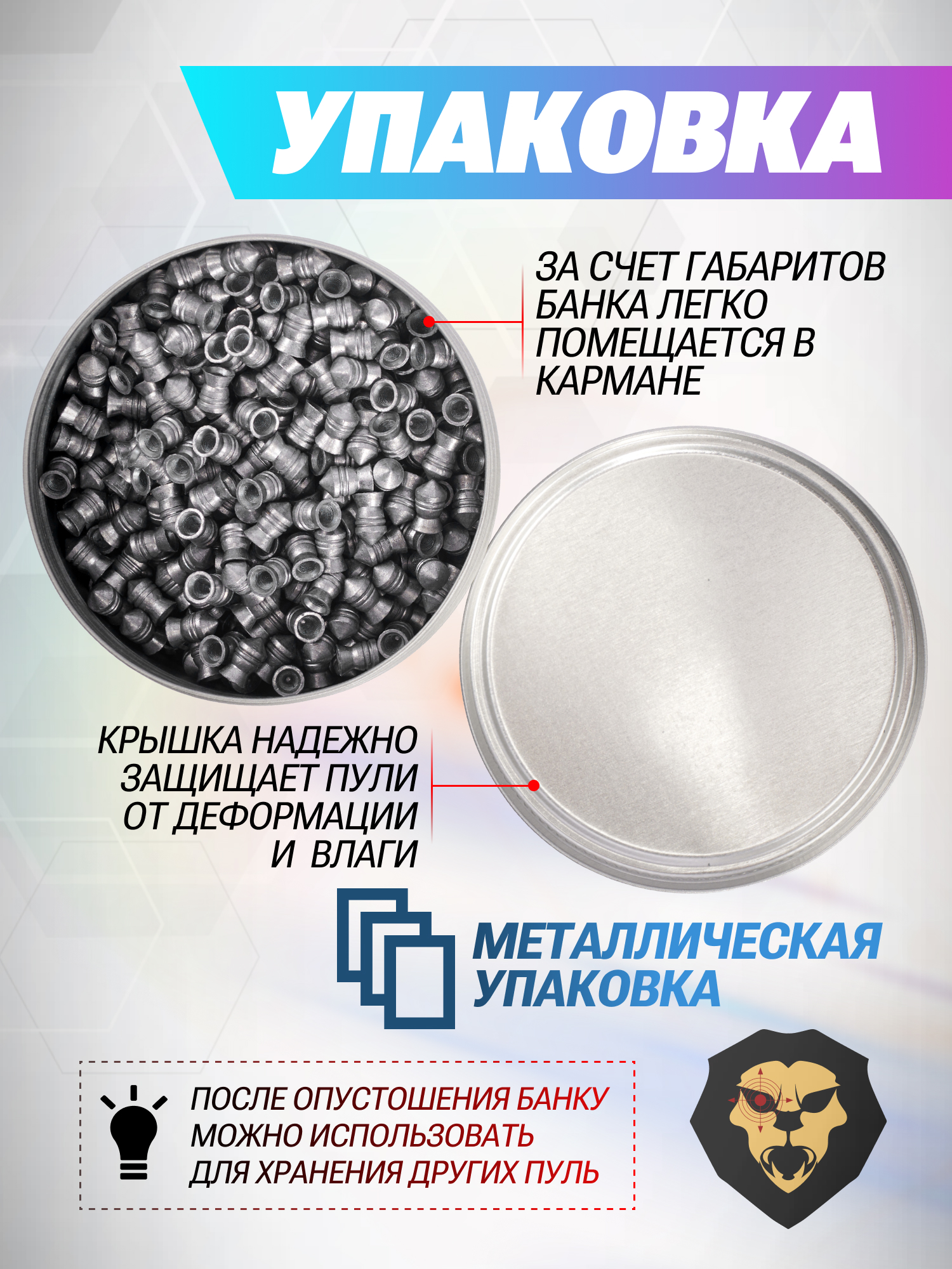 Для транспортировки и хранения предусмотрена металлическая баночка, которая в этом случае умещает в себя 500 единиц снарядов. За счет крышки и компактных размеров тару допускается переносить как в кармане, так и в рюкзаке, поскольку не займет много места.