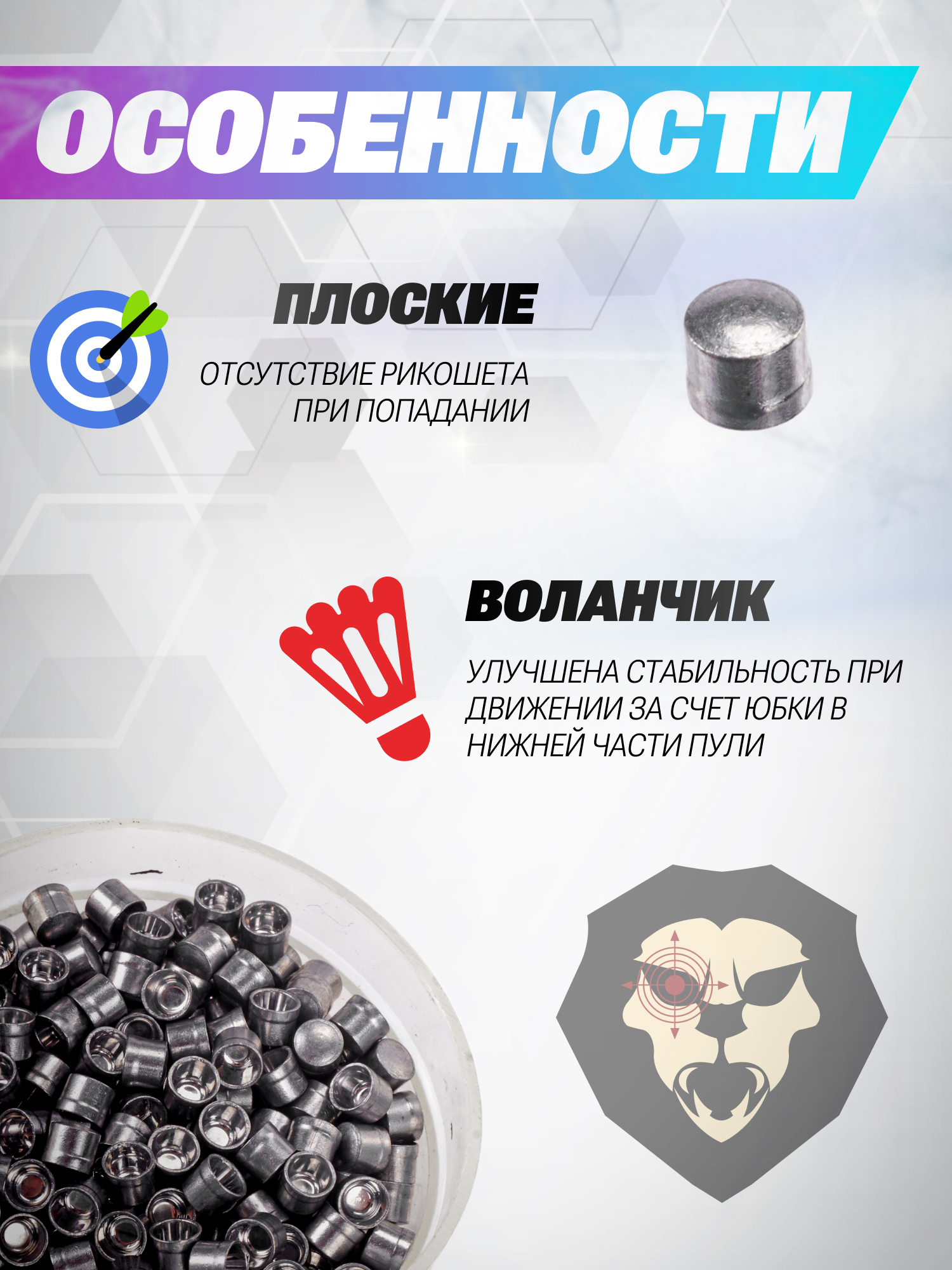 | Особенности | Пониженная вероятность рикошета |