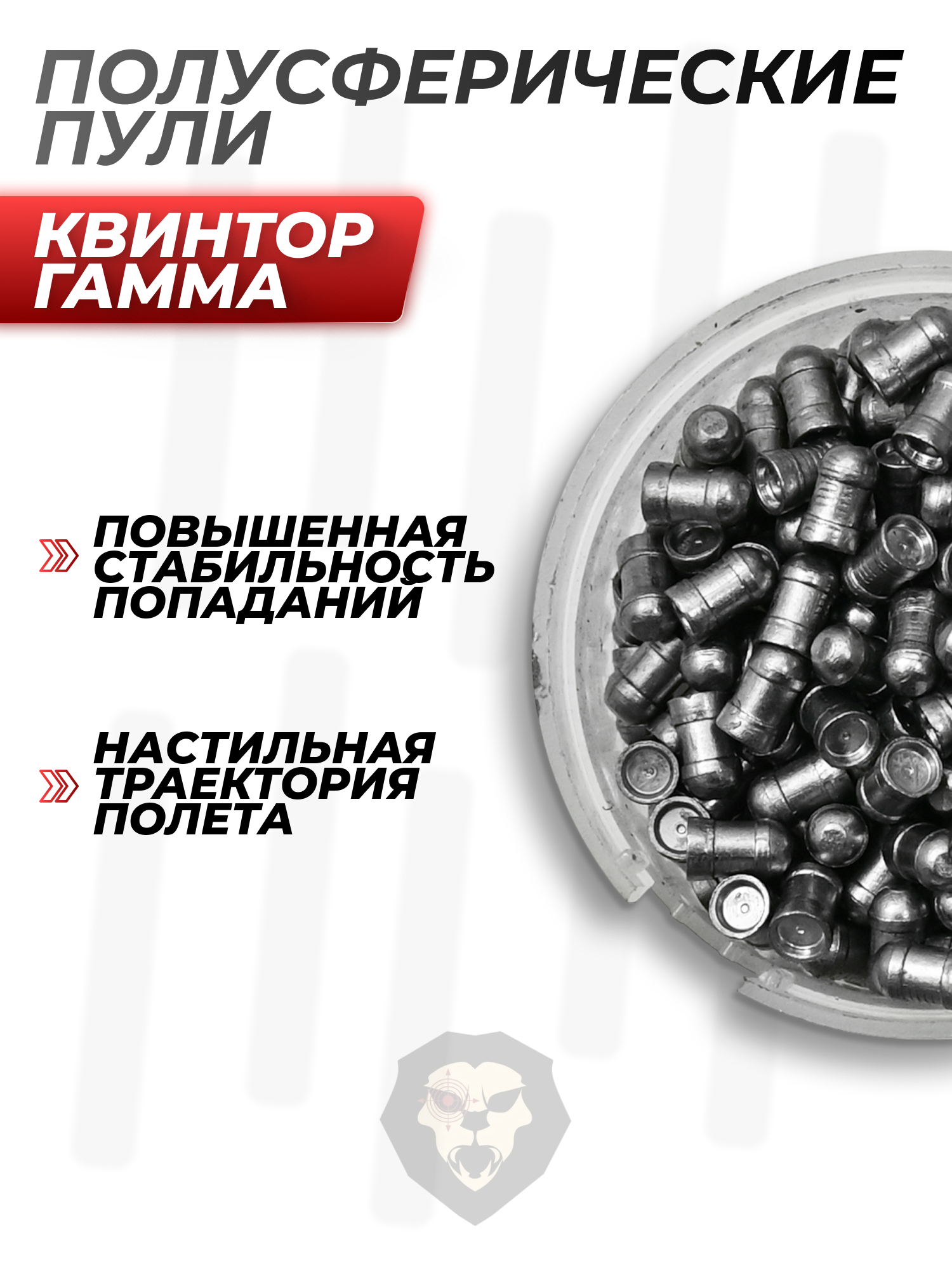 Такие боеприпасы с диаметром 4.5 мм отличаются повышенными аэродинамическими свойствами, причиной которых является полусферический выступ во фронтальной части снаряда. Представленные пули выполняются из свинца, обеспечивая минимум разрушительного воздействия на стволы из стали. Перед появлением на гражданском рынке пульки для пневматики Квинтор упаковываются в пластиковые баночки, в каждую из которых помещается по 200 единиц боеприпасов весом 1 грамм.