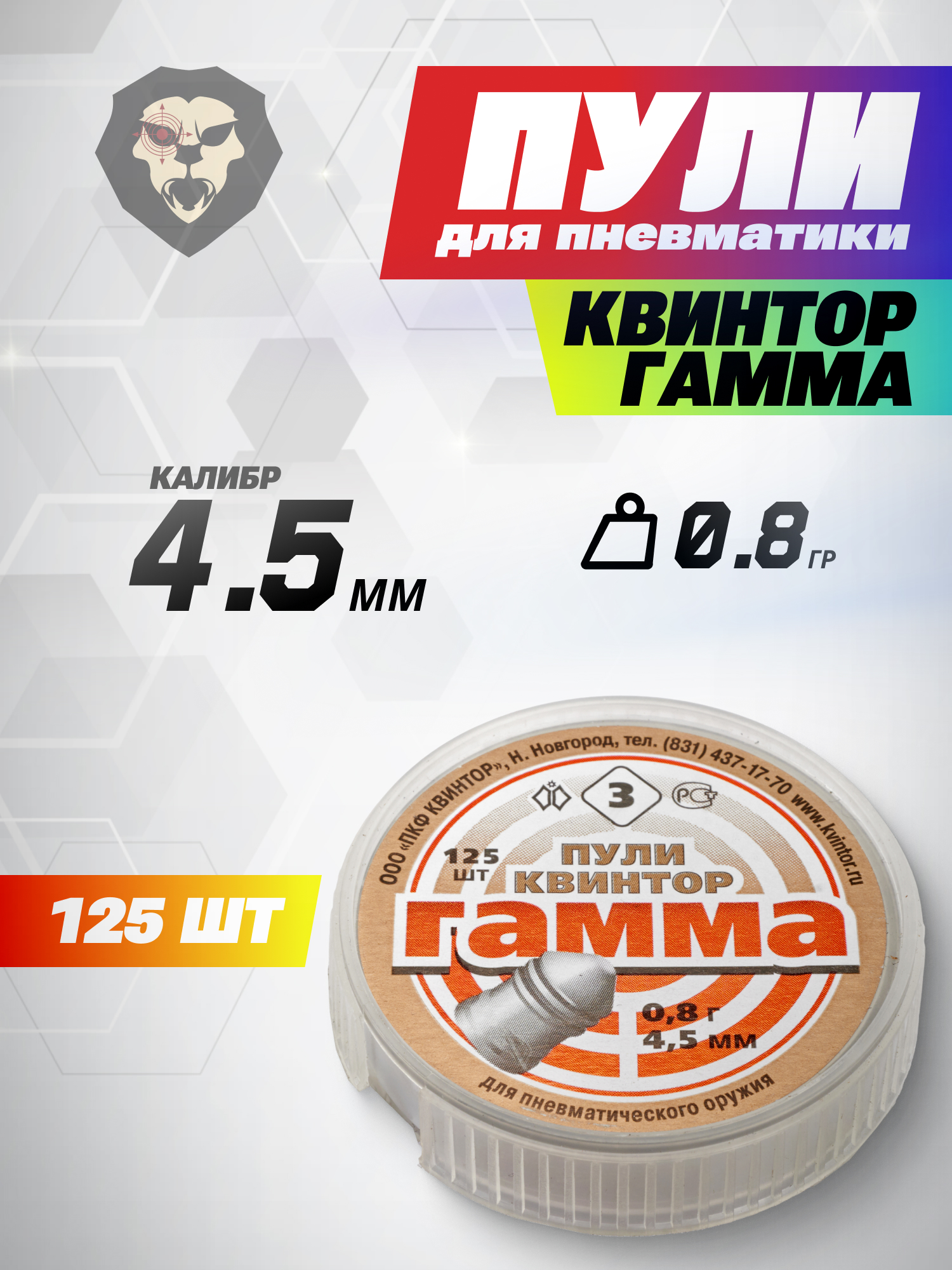 Информация о товаре "Пули пневматические Квинтор Гамма 4.5 мм (125 шт, 0.8 г)" носит ознакомительный характер, и не является публичной офертой, определяемой положениями Статьи 437 Гражданского кодекса Российской Федерации, характеристики, внешний вид, цвет и комплектация могут быть изменены производителем без уведомления.