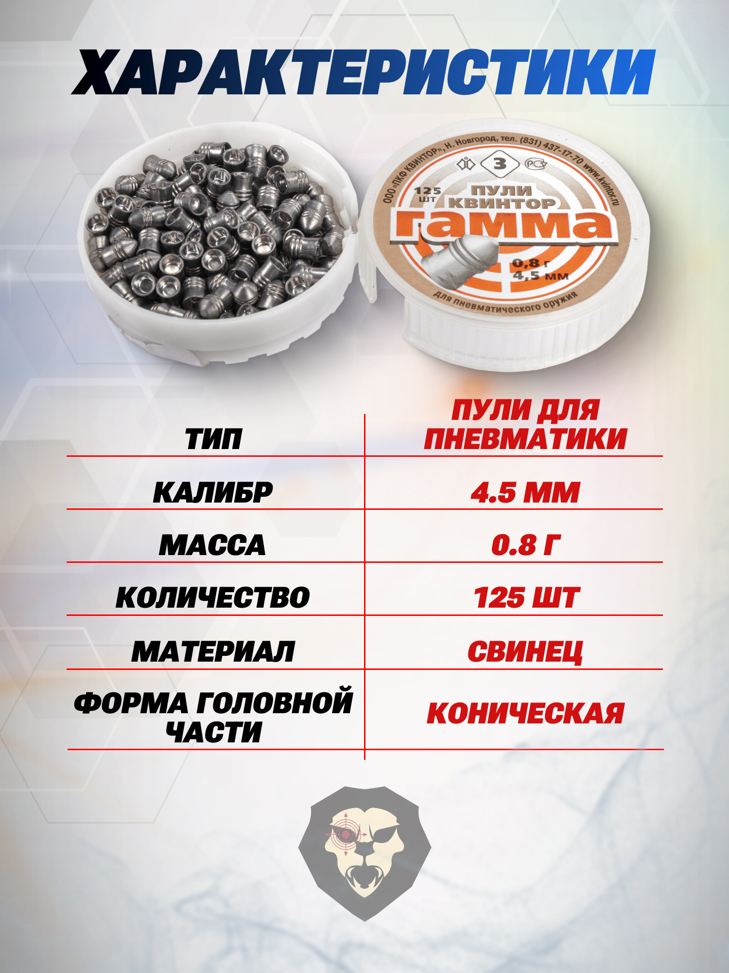 Российская фирма Kvintor предлагает стрелкам с пневматикой ознакомиться со списком своих свинцовых боеприпасов под нарезные стволы. Товарный ряд отмеченного предприятия насыщен всевозможными метательными образцами различного типа исполнения, что позволяет остановиться на предпочитаемых и необходимых пулях относительно оружия и целей. Отдельного упоминания от этого бренда заслуживает популярная линейка Гамма.