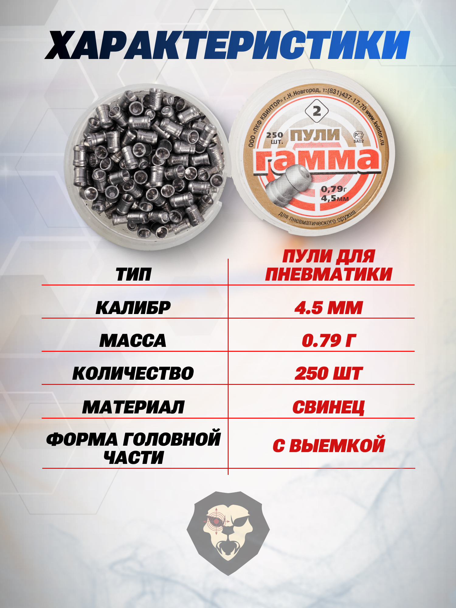 Пули Квинтор Гамма весом 0.79 грамм выполнены из свинца с добавками, увеличивающими жёсткость. Масса и калибр Пули Гамма 4.5 миллиметра подойдёт для стрельбы из пневматики класса Магнум.
