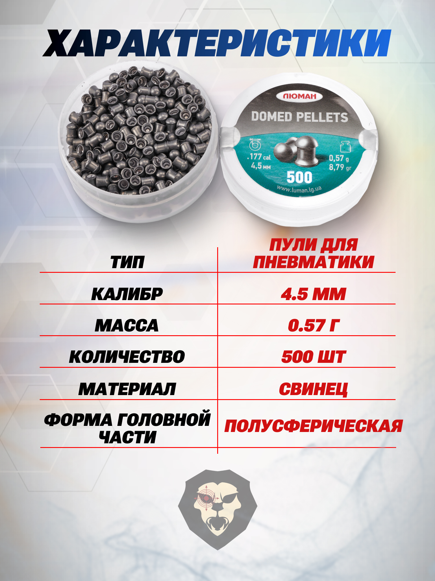 В магазины Люман Domed Pellets 4.5 миллиметра поставляются в металлических банках, в которых возможно разместить до 500 пулевых снарядов.