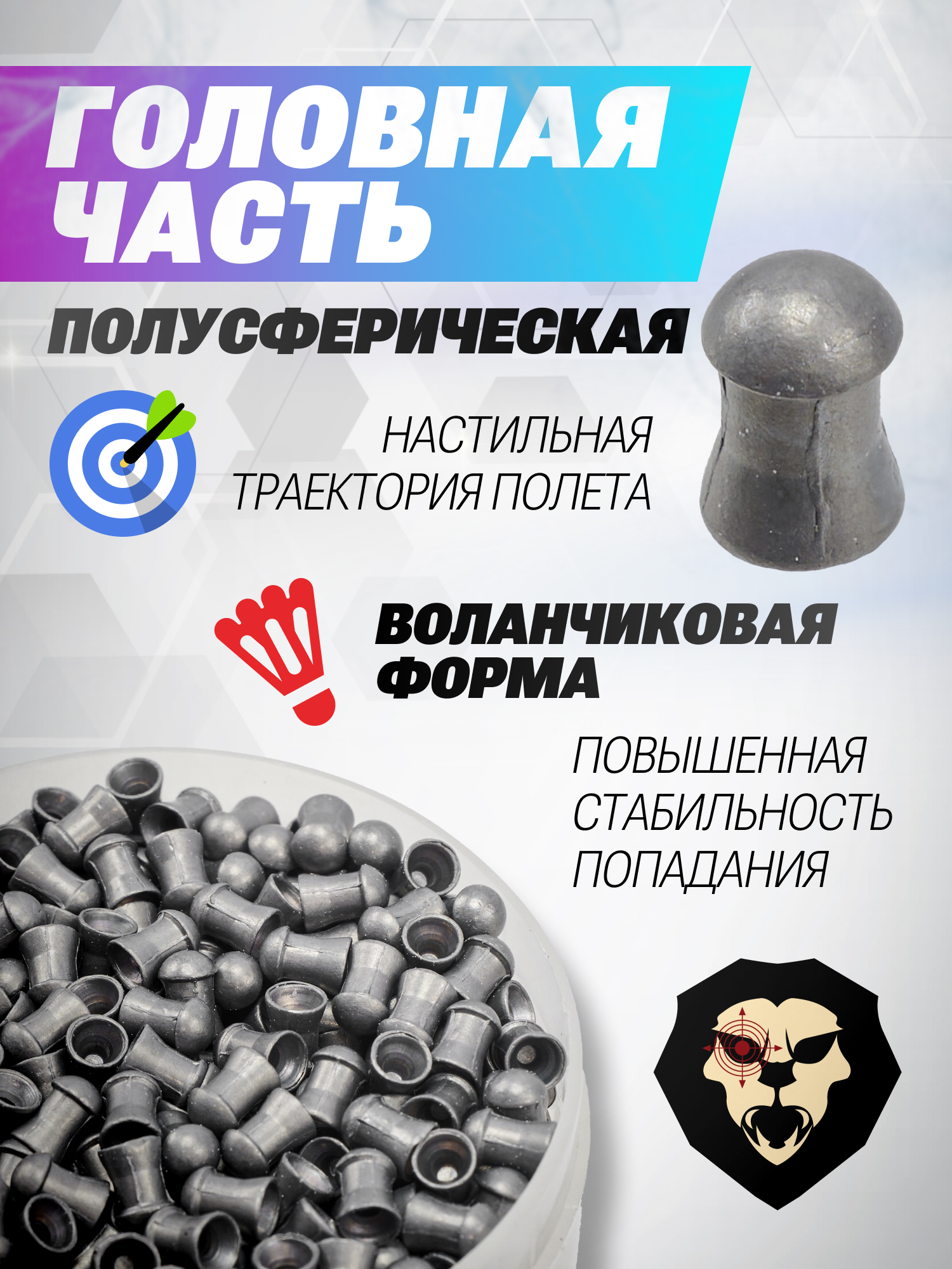 Представленные 0.68-граммовые пульки Люман выполнены из свинца, что способствует их мягкому взаимодействию с содержащимися в конструкции пневматики стальными стволиками. Полусферический выступ в передней части боеприпаса обеспечивает повышенные аэродинамические характеристики в процессе полета. Рассматриваемые снаряды Филд Таргет поставляются на рынок в пластиковых баночках по 500 штук в каждой.