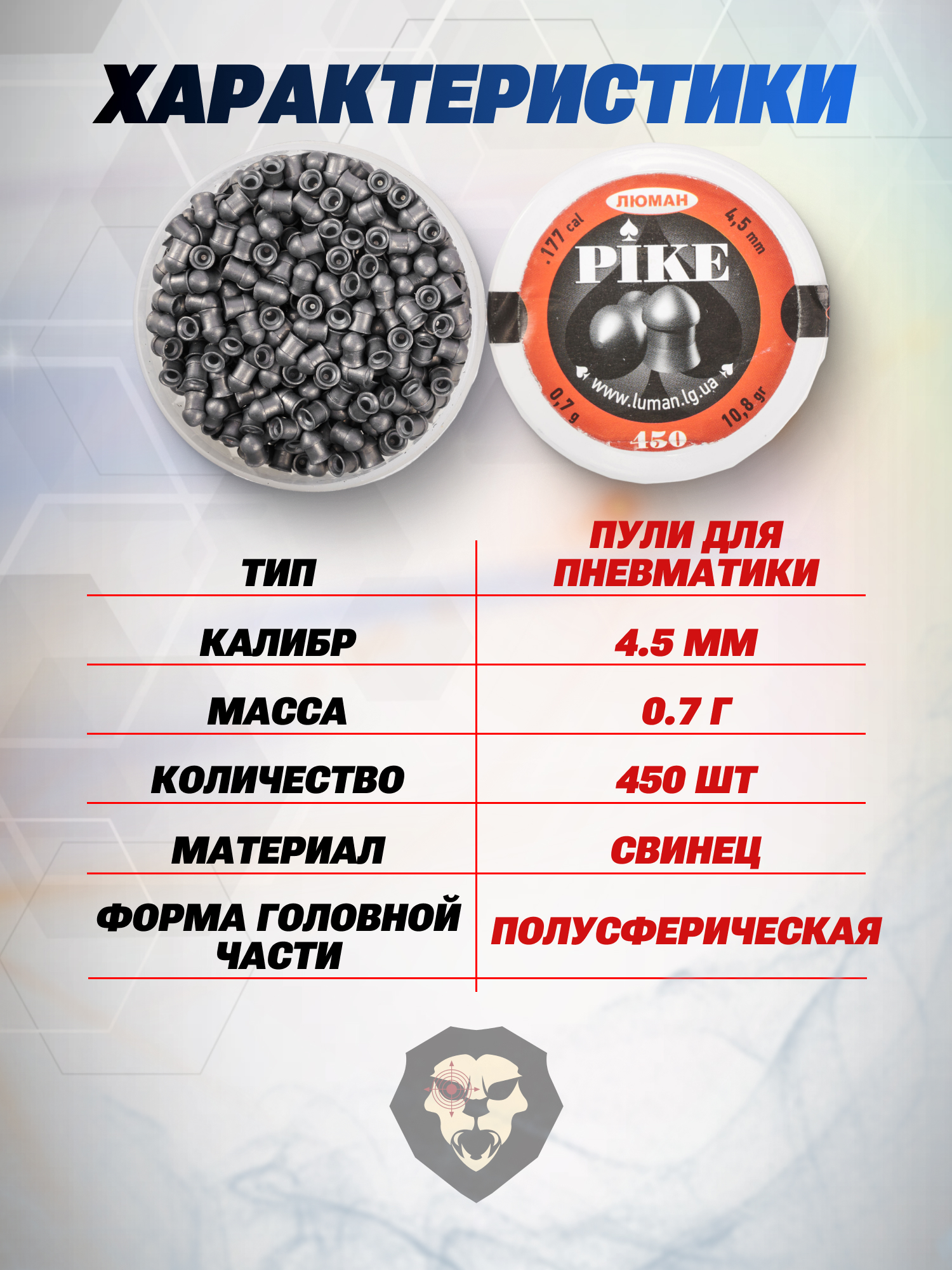 Люман Pike – это боеприпас из свинца в калибре 4.5 мм произведенный методом штамповки, головка снаряда изготовлена в оживальной форме. Масса такого снаряда достигает 0.7 грамм, и подпадает под категорию тяжелых воланчиковых пуль с повышенной характеристикой кучности.