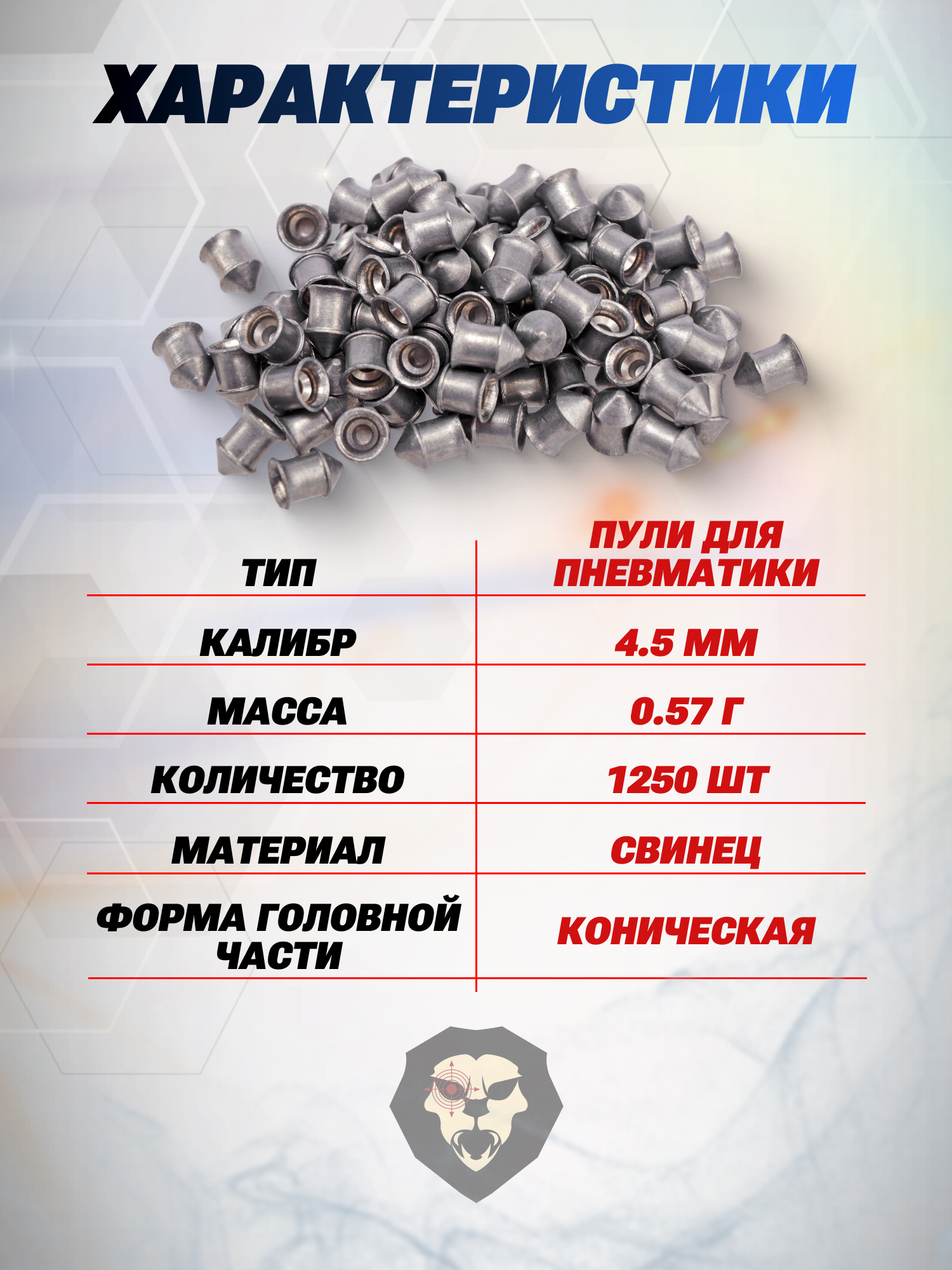 Представленные снаряды применяются с пневматическими винтовками и пистолетами, рассчитанными на калибр 4.5 мм. Изготавливаются такие боеприпасы из свинца, что способствует уменьшению степени разрушения ствола из стали. Пульки выполнены в форме конуса, которая обеспечивает повышение пробивной способности при попадании в цель. Перед поступлением на рынок представленные пули складывают по картонным коробкам в количестве 1250 единиц снарядов.