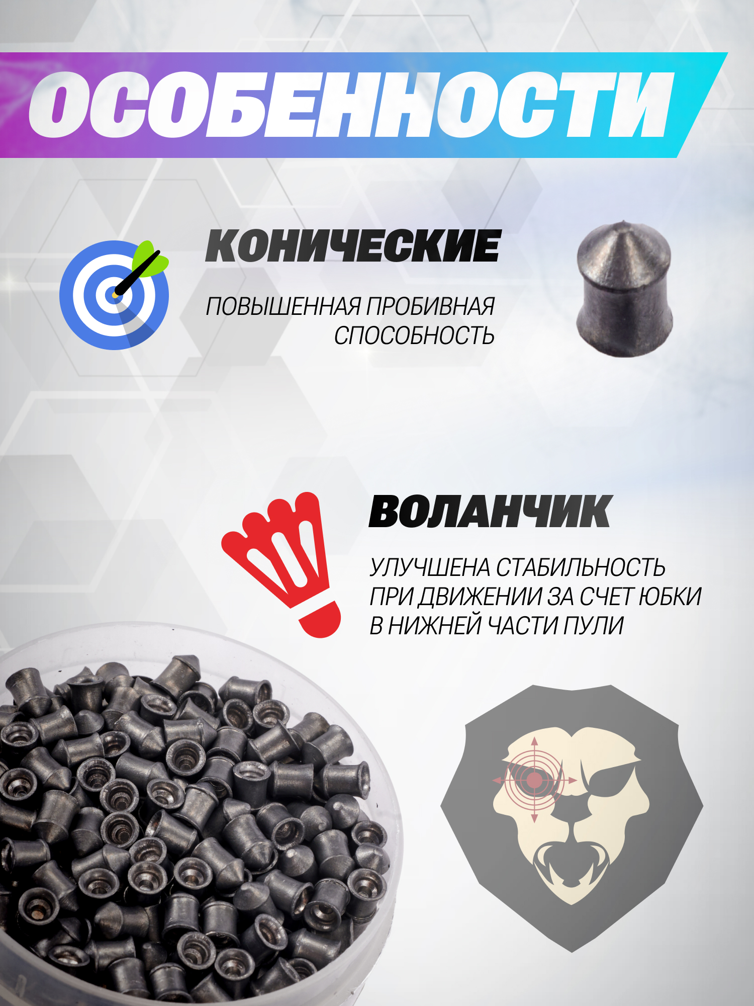 Область головы коническая, благодаря чему уменьшено сопротивление воздуху при полете, что положительно сказывается на предельной дальности выстрела. Для изготовления рассматриваемых изделий использовался свинец, калибр составляет 4.5 миллиметра.