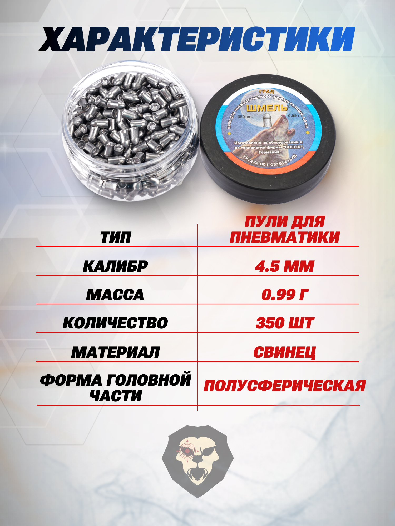 Информация о товаре "Пули пневматические Шмель Град 4.5 мм (0.99 г, 350 шт)" носит ознакомительный характер, и не является публичной офертой, определяемой положениями Статьи 437 Гражданского кодекса Российской Федерации, характеристики, внешний вид, цвет и комплектация могут быть изменены производителем без уведомления.