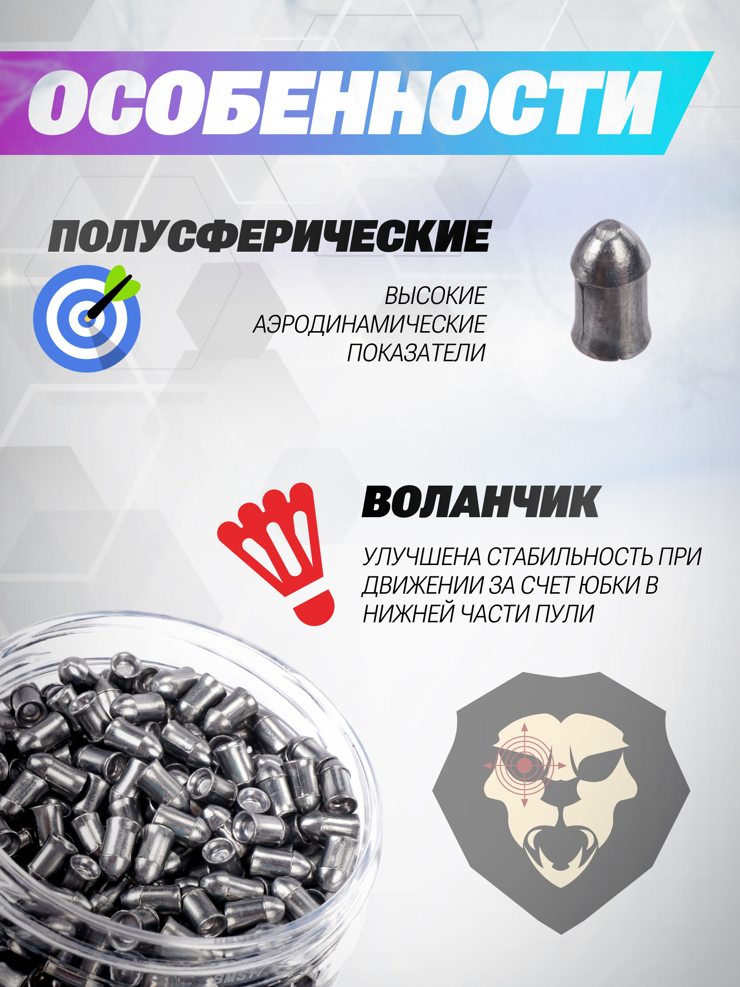Диаметр представленных экземпляров предполагает совместную эксплуатацию с пневматическим оружием, оборудованным нарезным стволом под калибр 4.5 миллиметра. Конструктивной особенностью выступает полусферическая форма головного участка, улучшающая качества аэродинамики заряда после выстрела.