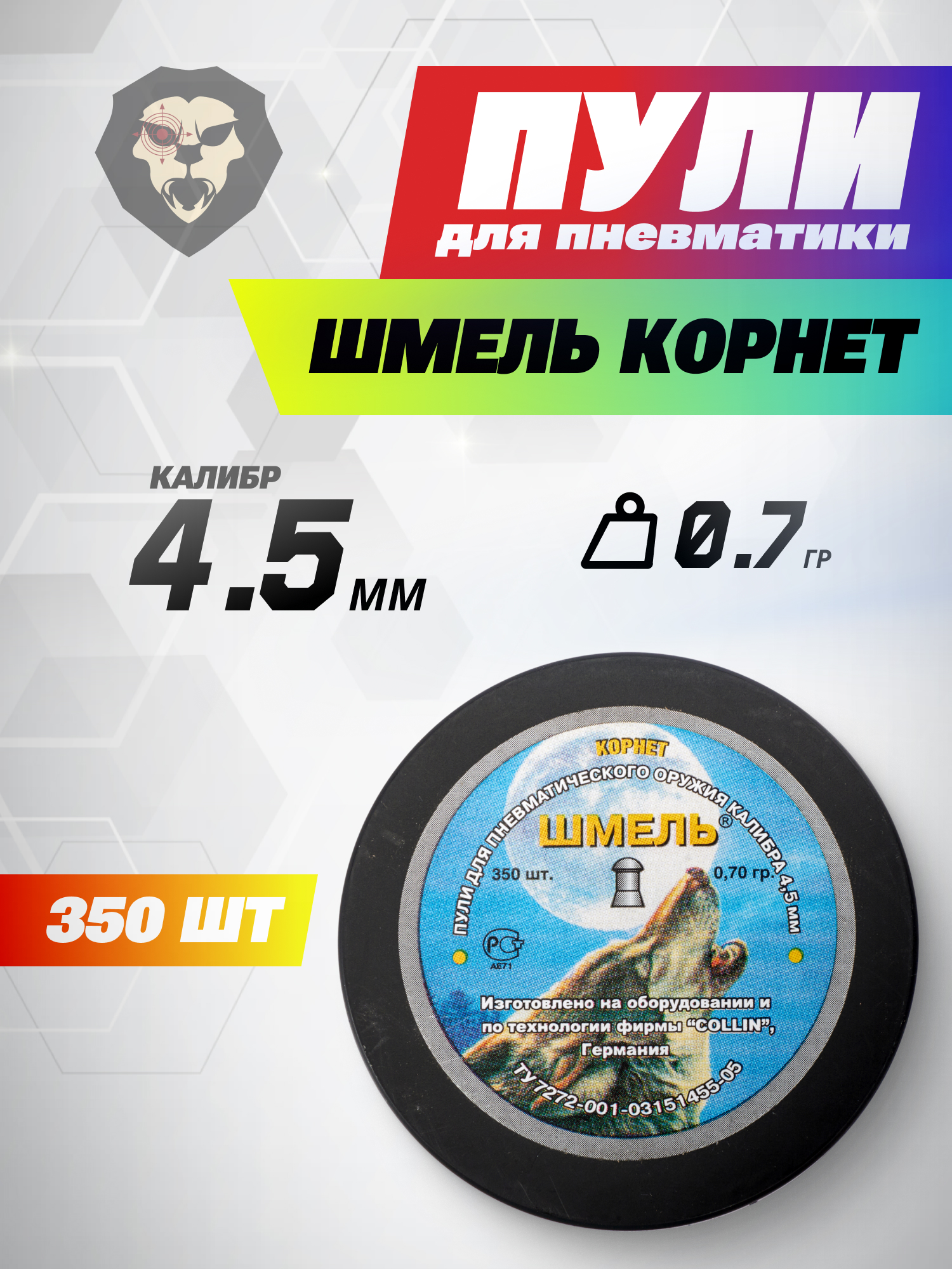 Информация о товаре "Пули пневматические Шмель Корнет 4.5 мм (0.7 г, 350 шт)" носит ознакомительный характер, и не является публичной офертой, определяемой положениями Статьи 437 Гражданского кодекса Российской Федерации, характеристики, внешний вид, цвет и комплектация могут быть изменены производителем без уведомления.
