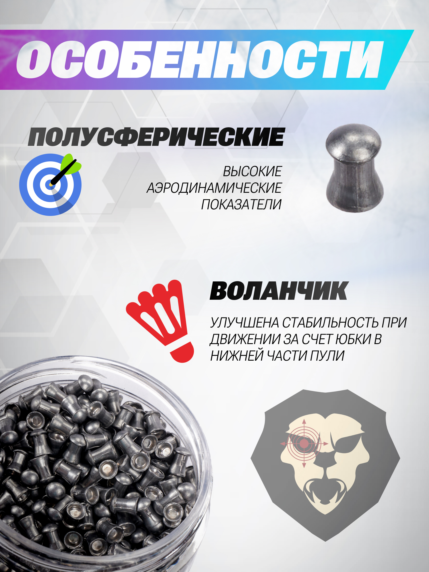 Достижение стабильных баллистических показателей при эксплуатации пневматических винтовок и пистолетов требует тщательного подбора снарядов. Немаловажную роль в этом процессе играет соотношение стоимости и качества боеприпасов, что делает продукцию бренда Шмель востребованной среди стрелков. Ассортимент компании включает решения со всевозможной геометрией головного участка пуль, различной массой и калибром, что позволяет выбрать образцы под конкретные эксплуатационные требования.