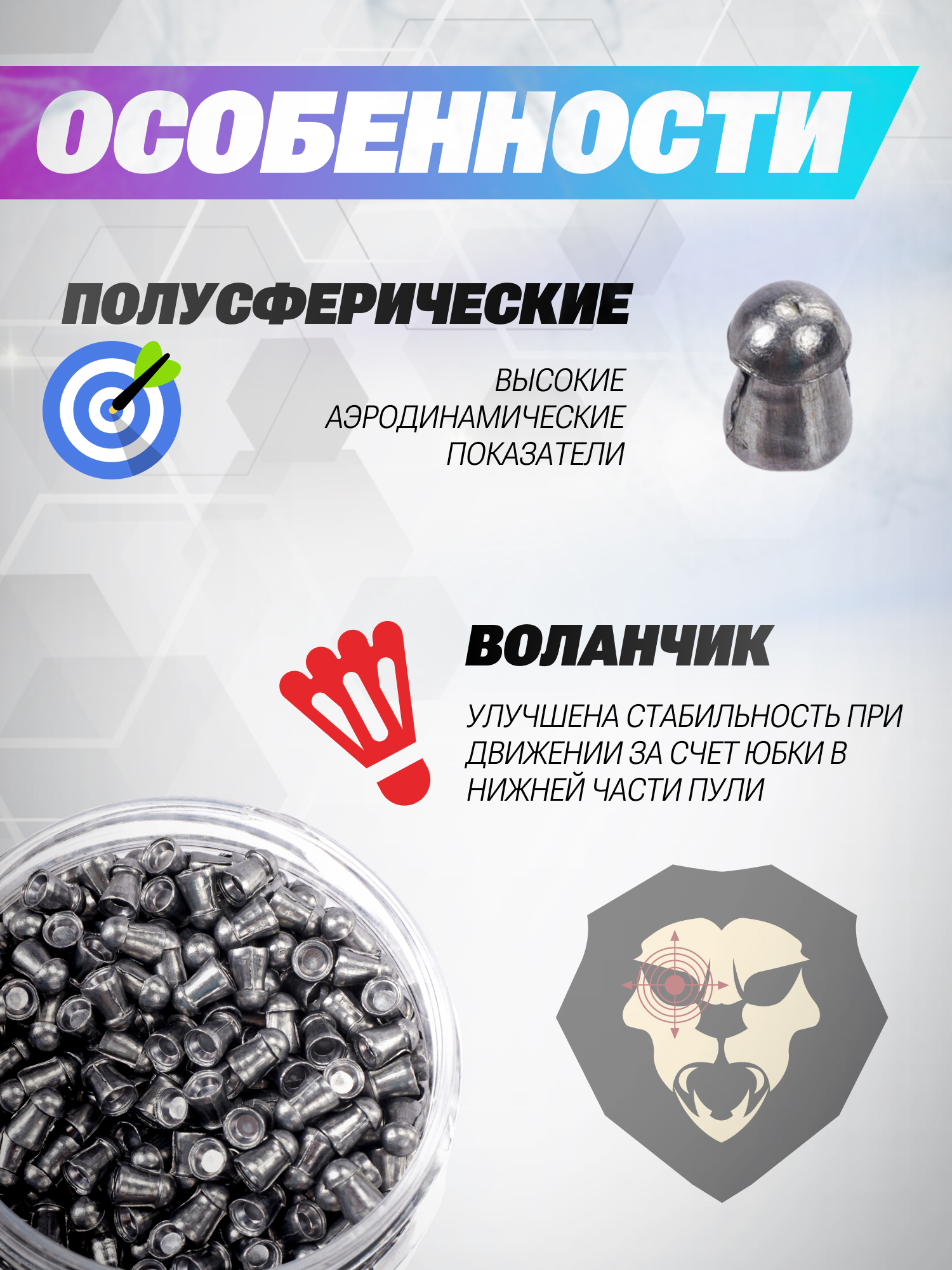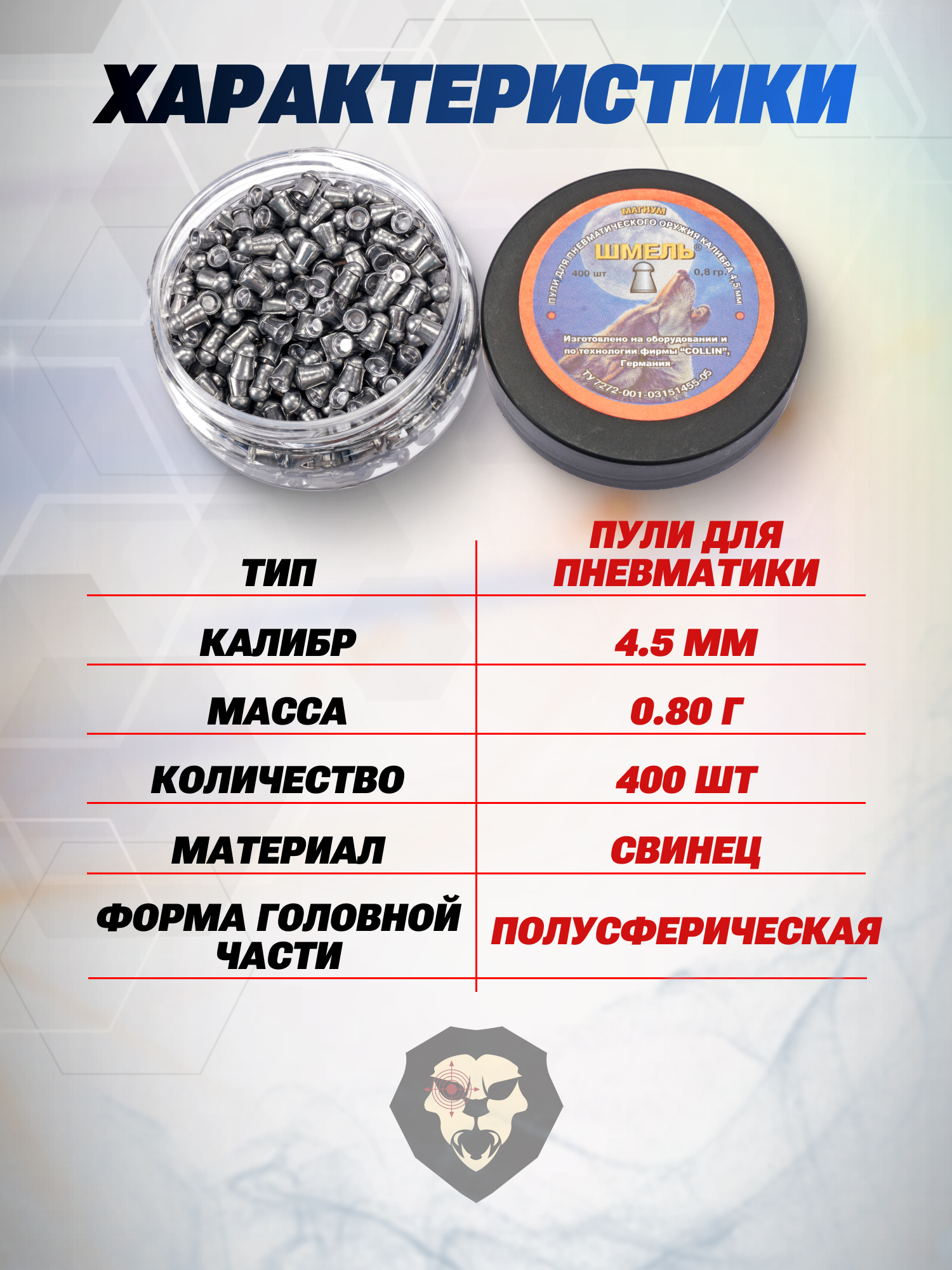 Представленные 0.80-граммовые боеприпасы используются в охоте при стрельбе из платформ повышенной мощности с 4.5-миллиметровым дульным срезом. Во фронтальном сегменте пульки имеется выступ в форме полусферы для увеличенных показателей аэродинамичности летящего боеприпаса. Пули для пневматики Шмель стрелкам отпускаются по 400 единиц снарядов, помещенных в пластиковые баночки.