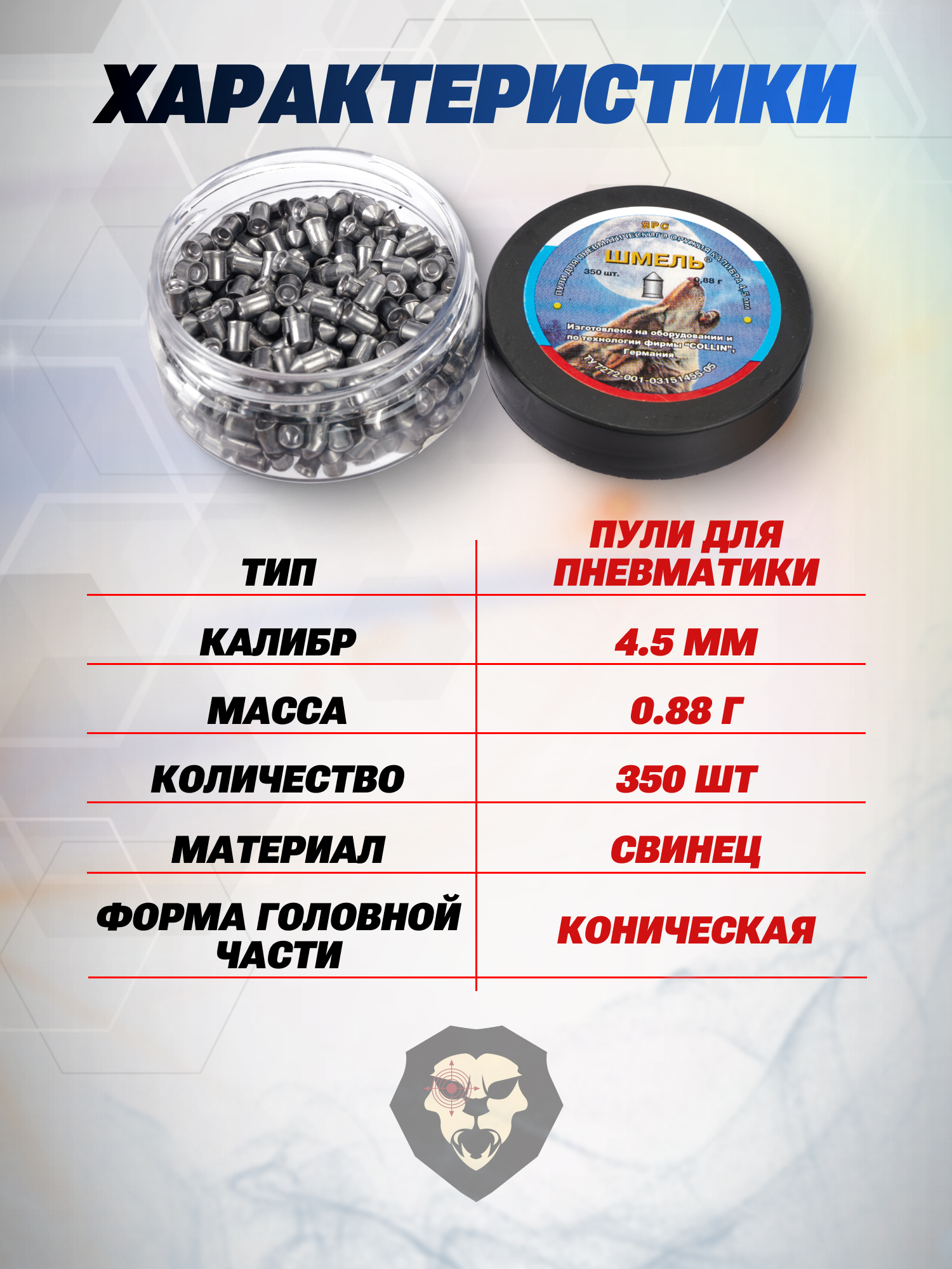 Шмель пули для пневматики 4.5 производятся на немецком станочном оборудовании марки Коллин. Благодаря этому боеприпас обеспечен повторяемостью массы и выстрела соответственно.