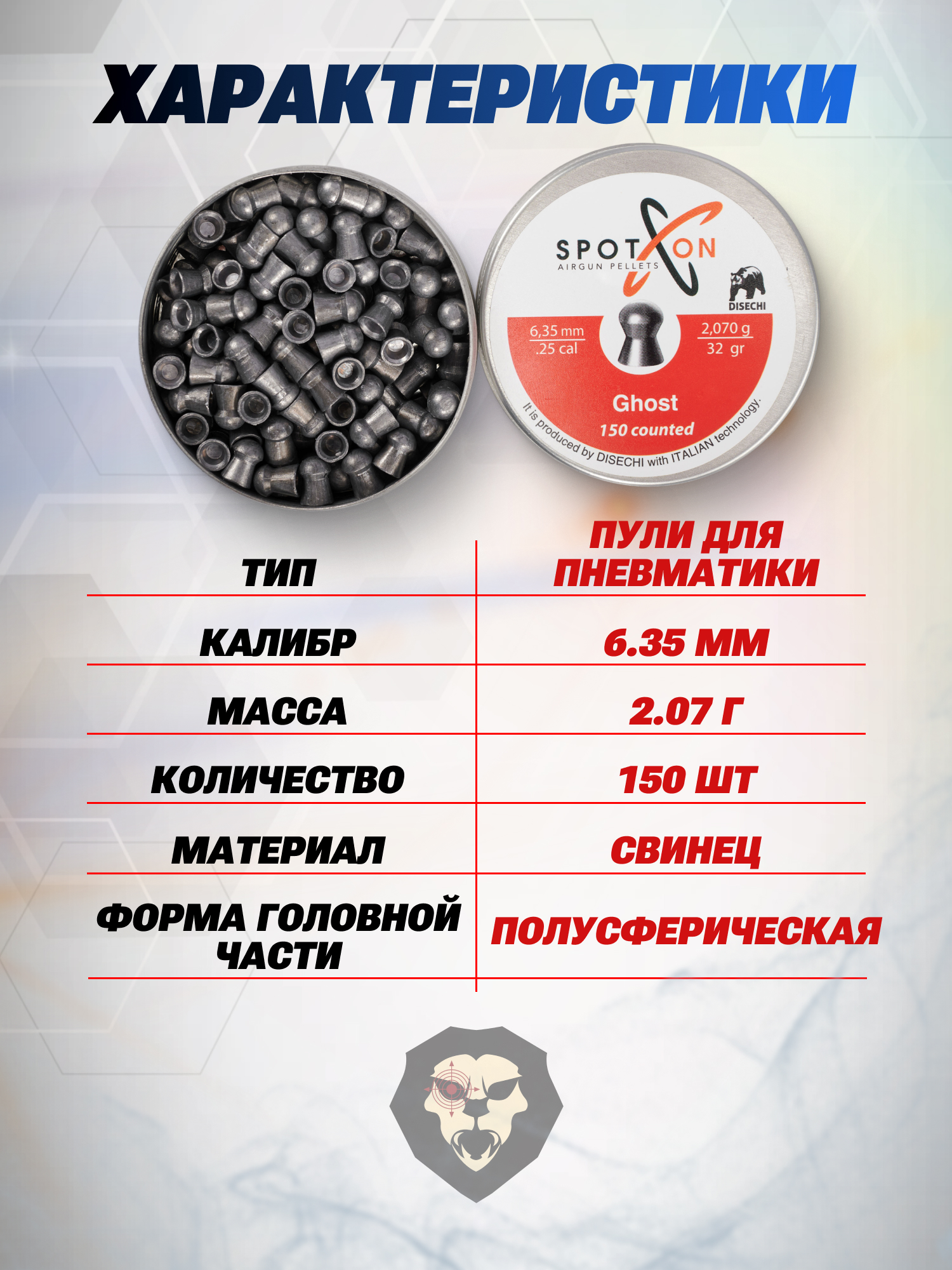 Информация о товаре "Пули пневматические Spoton Disechi Ghost 6.35 мм (2.07 грамма, 150 шт)" носит ознакомительный характер, и не является публичной офертой, определяемой положениями Статьи 437 Гражданского кодекса Российской Федерации, характеристики, внешний вид, цвет и комплектация могут быть изменены производителем без уведомления.
