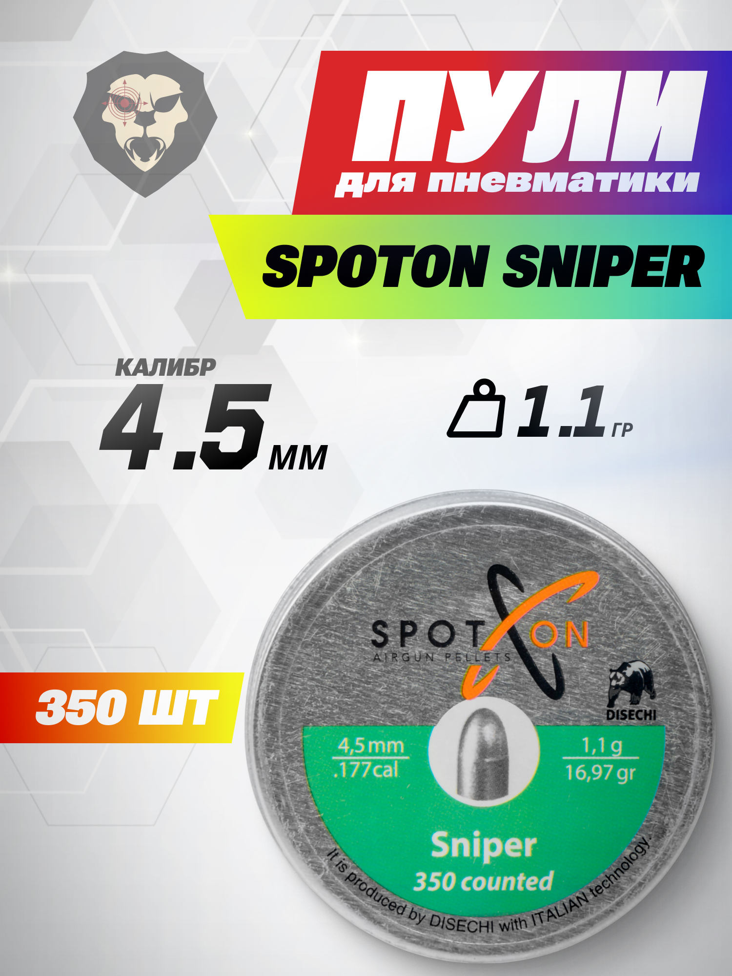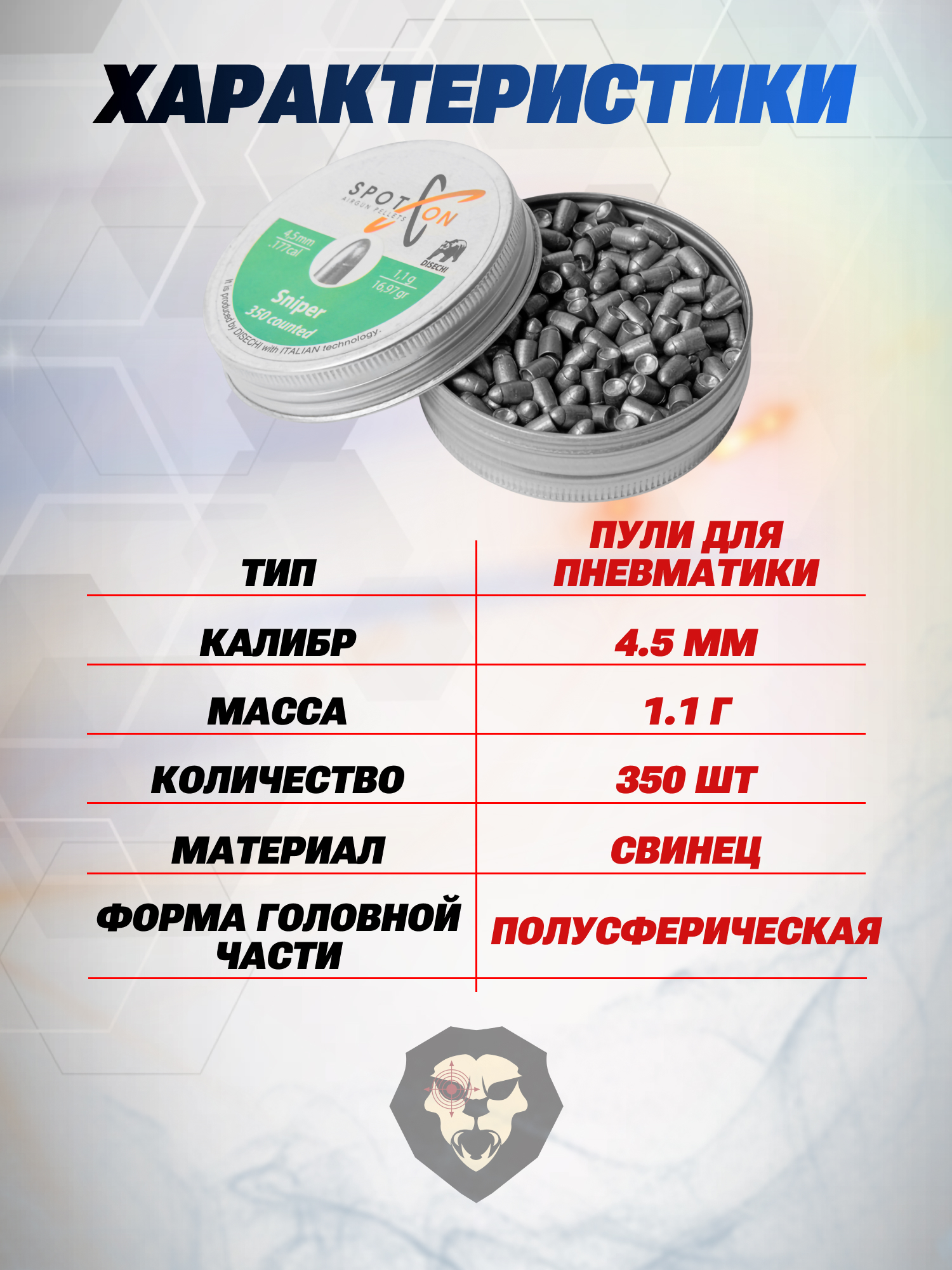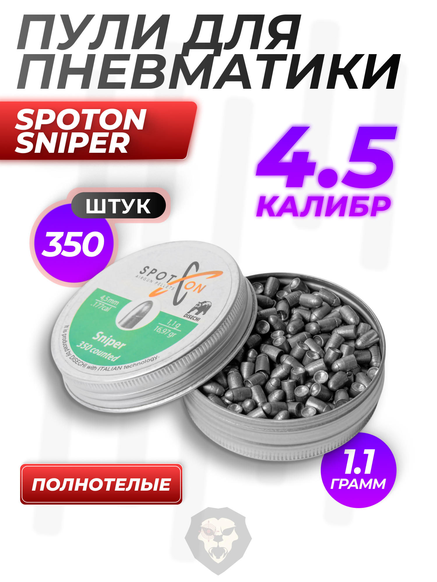 Информация о товаре "Пули пневматические Spoton Sniper 4.5 мм (1.1 г, 350 шт)" носит ознакомительный характер, и не является публичной офертой, определяемой положениями Статьи 437 Гражданского кодекса Российской Федерации, характеристики, внешний вид, цвет и комплектация могут быть изменены производителем без уведомления.