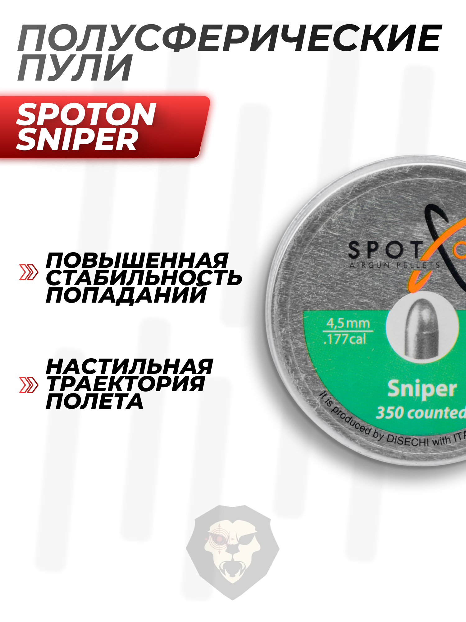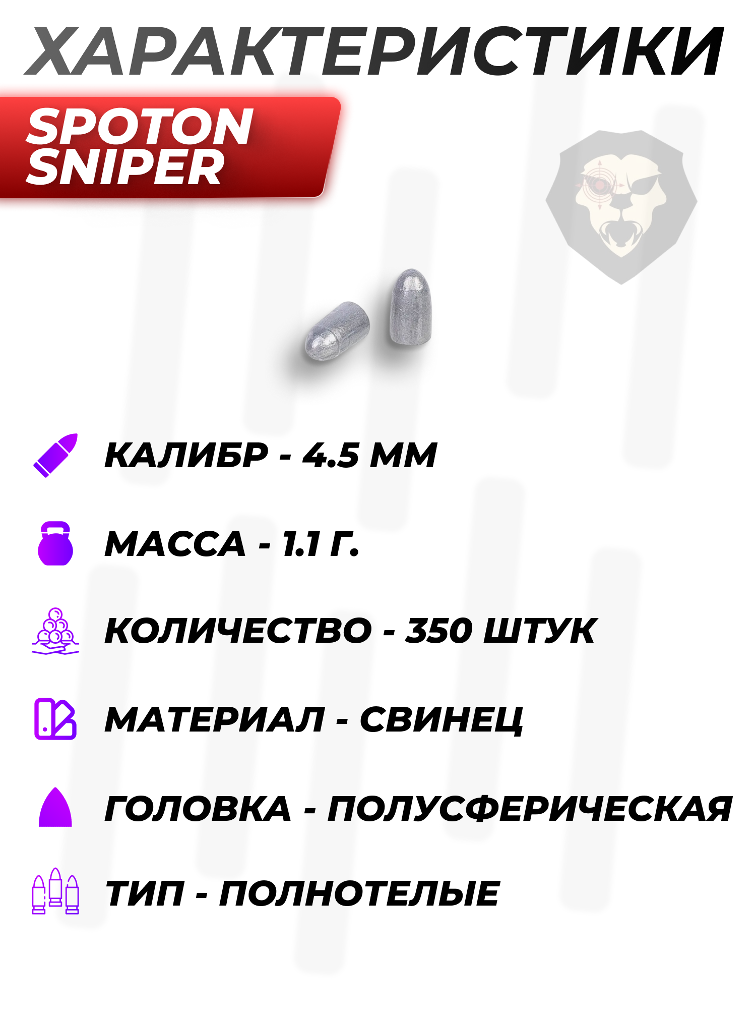 Пневматические пули 4.5 мм Спотон Снайпер изготавливаются из свинца. Задействуется современное высокоточное станочное оборудование, благодаря которому удается добиться минимального различия внешнего вида и массы зарядов в одной партии. Помимо предсказуемости выстрела стоит отметить стабильность траектории полета, что обуславливает обтекаемая полусферическая головка.