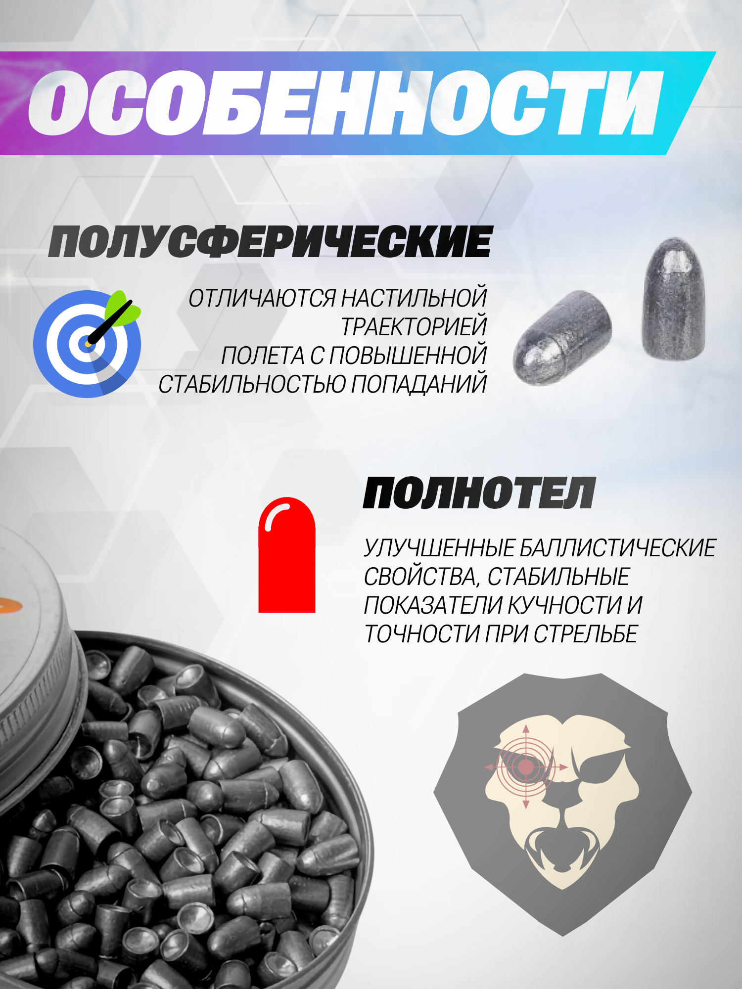 Поставляются боеприпасы в количестве 350 шт. Упаковкой выступает металлическая баночка, оснащенная плотной крышкой. Тара надежно оберегает содержимое от деформации, а также проникновения внутрь влаги и грязи, при этом без проблем поместится даже в кармане брюк.