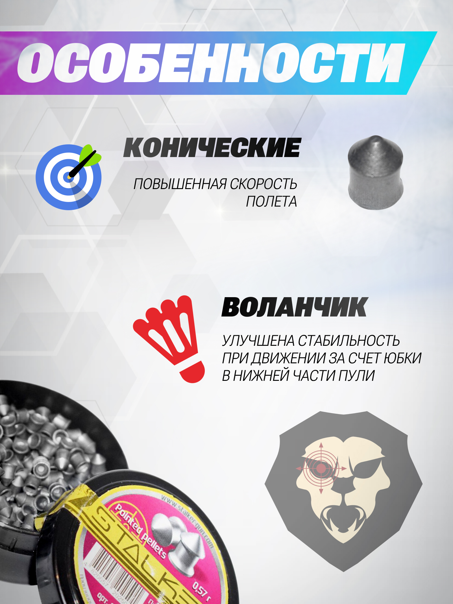 Совместимы описываемые боеприпасы с пневматическим оружием, изготовленным под калибр .177. В обозреваемом исполнении типоразмер головной части экземпляров представляет собой конический заостренный формат - за счет такого решения отмечается повышенная скорость полета снаряда.